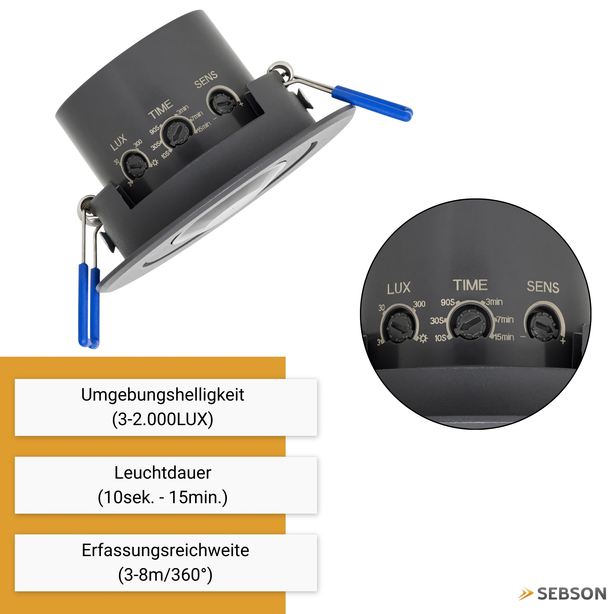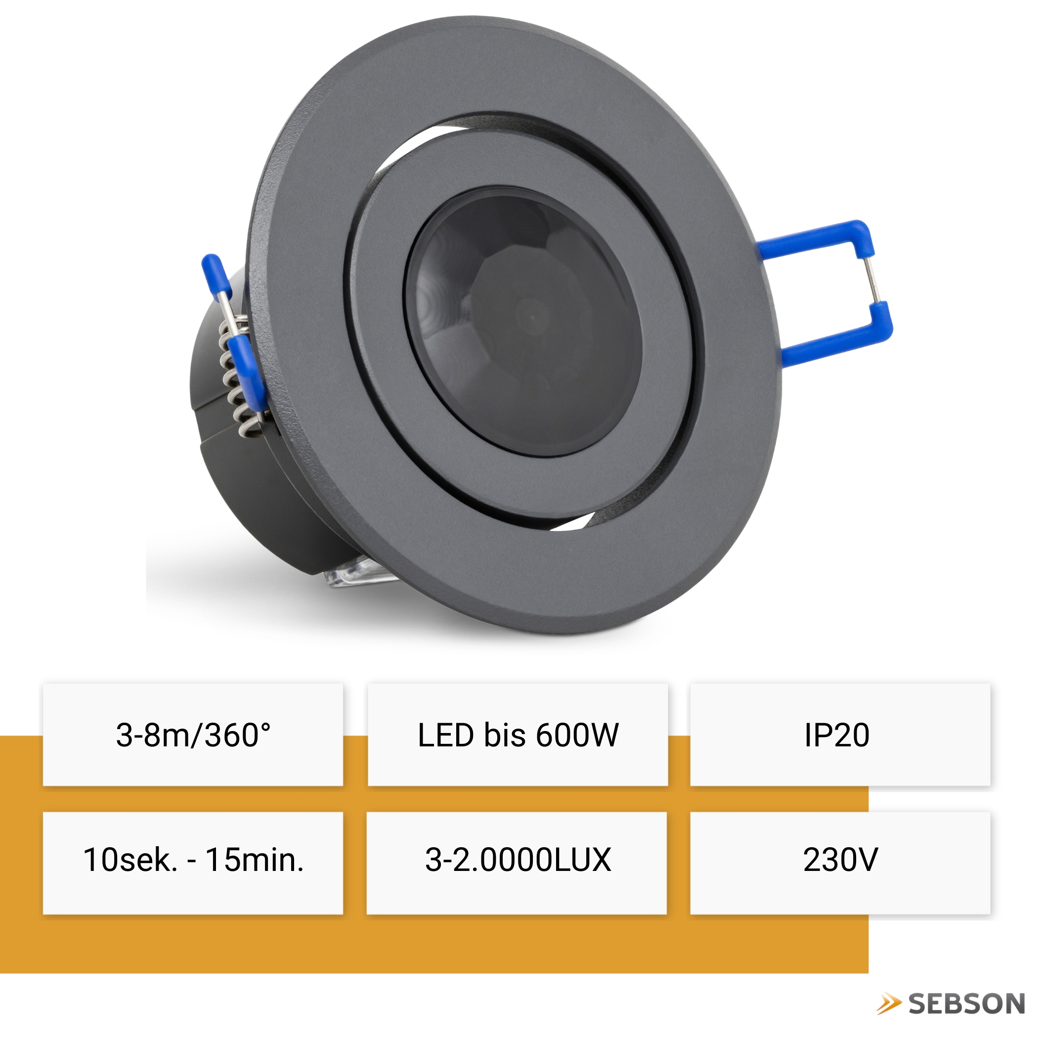Built-in, Range max. 3-8m/360°, swiveling, max. 1200/600W, IP20