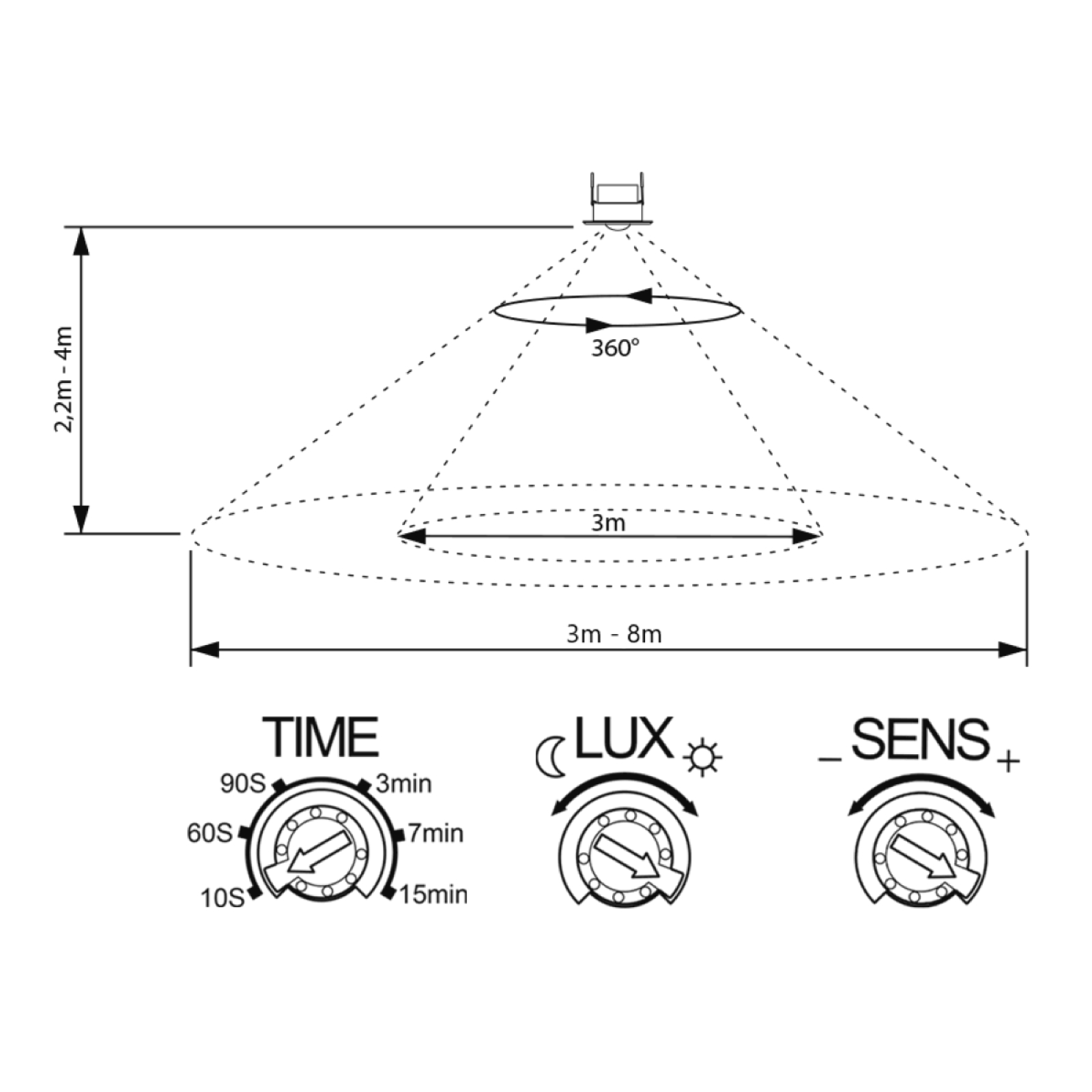 The detection range is up to 8 m with a detection angle of 360° and an installation height of 2.2–4 m.