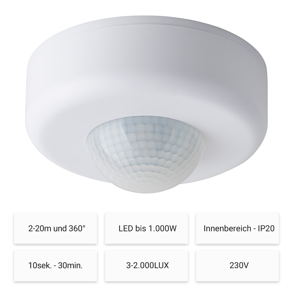 Surface-mounted, infrared, range 2-20m/360°, max. 1000/2000W, IP20, 3-wire