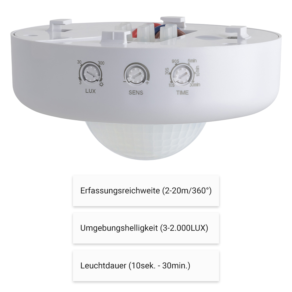 This motion detector with IR sensor detects even the slightest movements, such as breathing movements, of people and large animals. The lighting switches on within a detection range of 2-20 metres and a detection angle of 360°. After an adjustable time of approx. 10 seconds to 30 minutes, the motion detector switches the lighting off again when no more movement is detected. A control allows the switch-on sensitivity of this device to be adjusted depending on the ambient brightness (in the range between 3 and 2,000 LUX). In addition, the breathing detection range can be adjusted between 2-6m and the detection range for active movements between 10-20m.