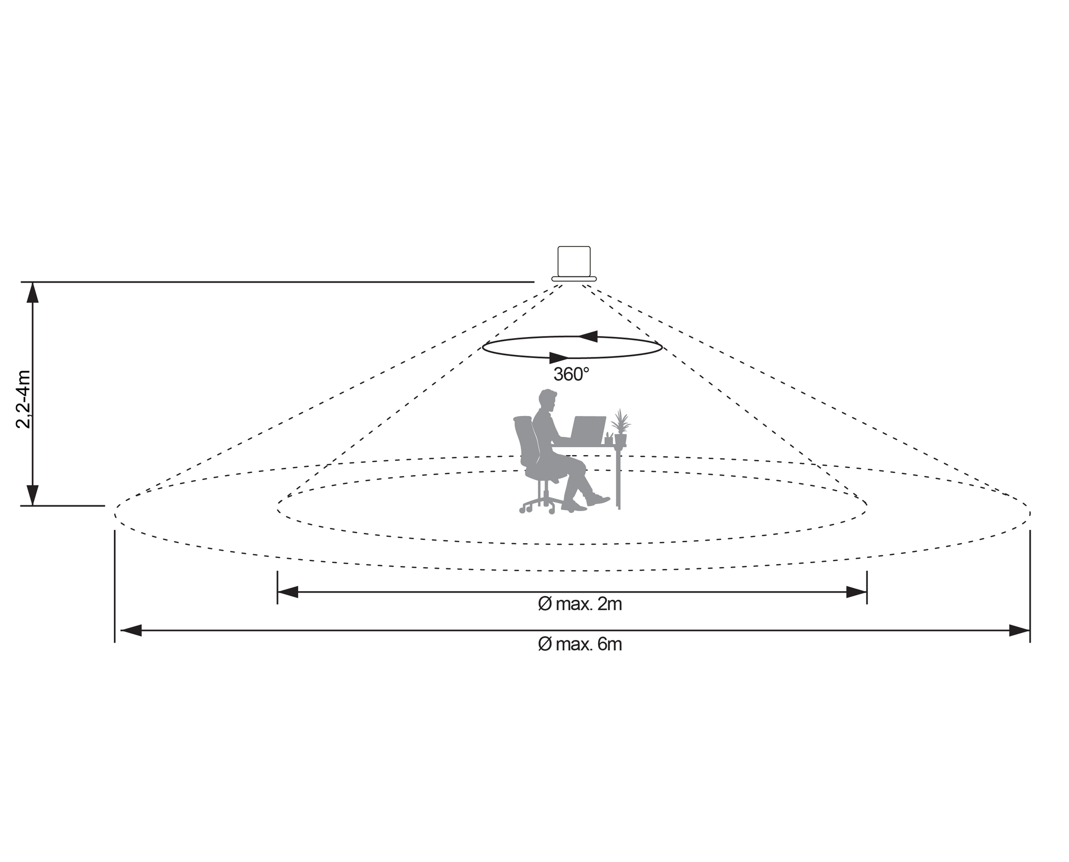 This motion detector recognises both movements at rest, e.g. seated activities (breathing movements), and active movements. The sensor detects even the smallest movements, such as breathing, with a detection range of 2m and an installation height of 2.2–4m. The detection range covers up to 6m for active movements.