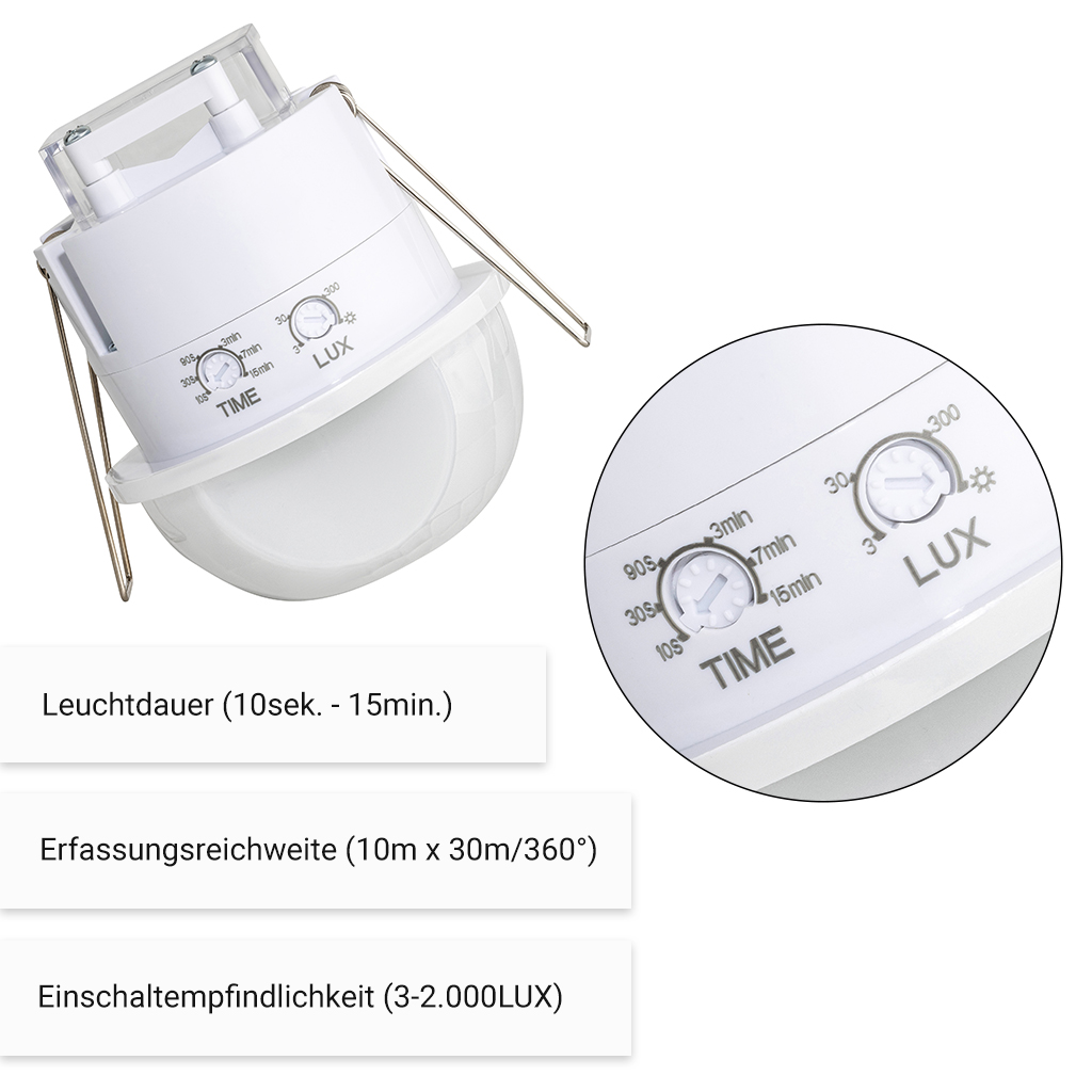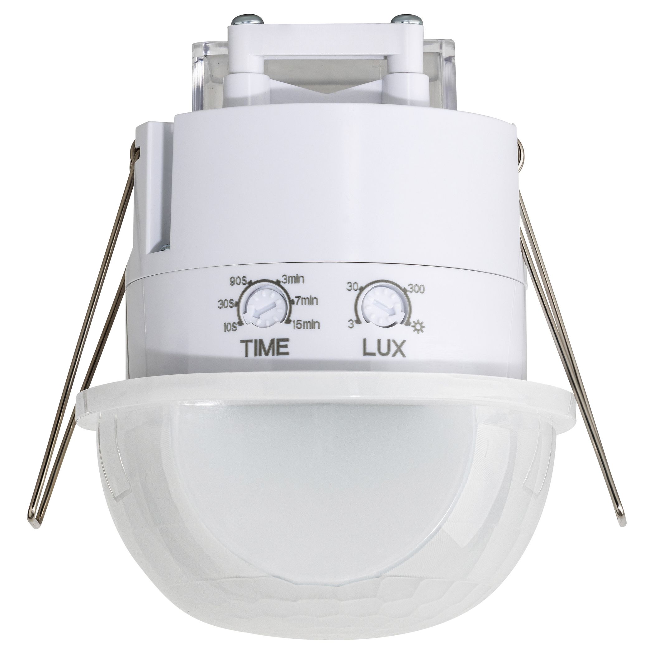 This motion detector with IR sensor recognises movements of people and large animals. The lighting switches on within a detection range of 10m x 30m with a detection angle of 360° (in open space) and switches on the lighting. After an adjustable time of approx. 10 seconds to 15 minutes, the motion detector switches the lighting off again if no more movement is detected. A controller can be used to regulate the switch-on sensitivity of this device depending on the ambient brightness (in the range between 3 and 2,000 LUX).