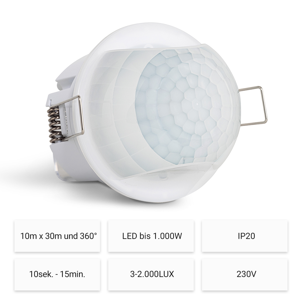 Flush-mounted, infrared, range 10m x 30m, max. 2000/1000W, IP20, 3-wire