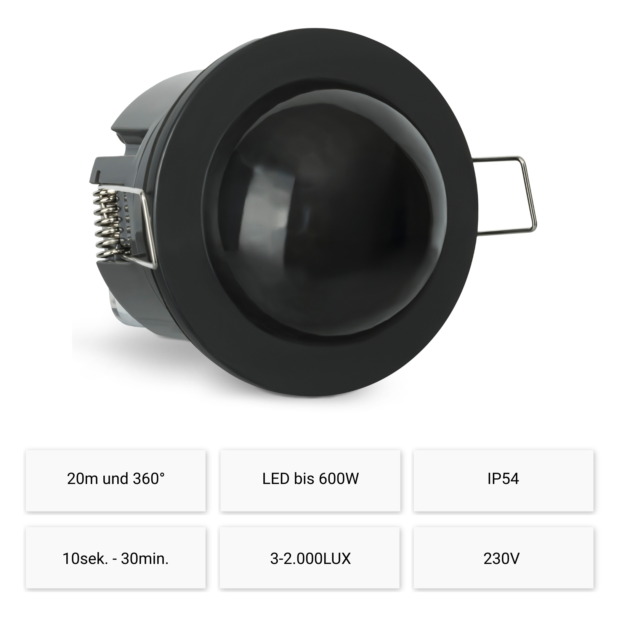 Flush-mounted, infrared, range 20m/360°, max. 1200/600W, IP54, 3-wire