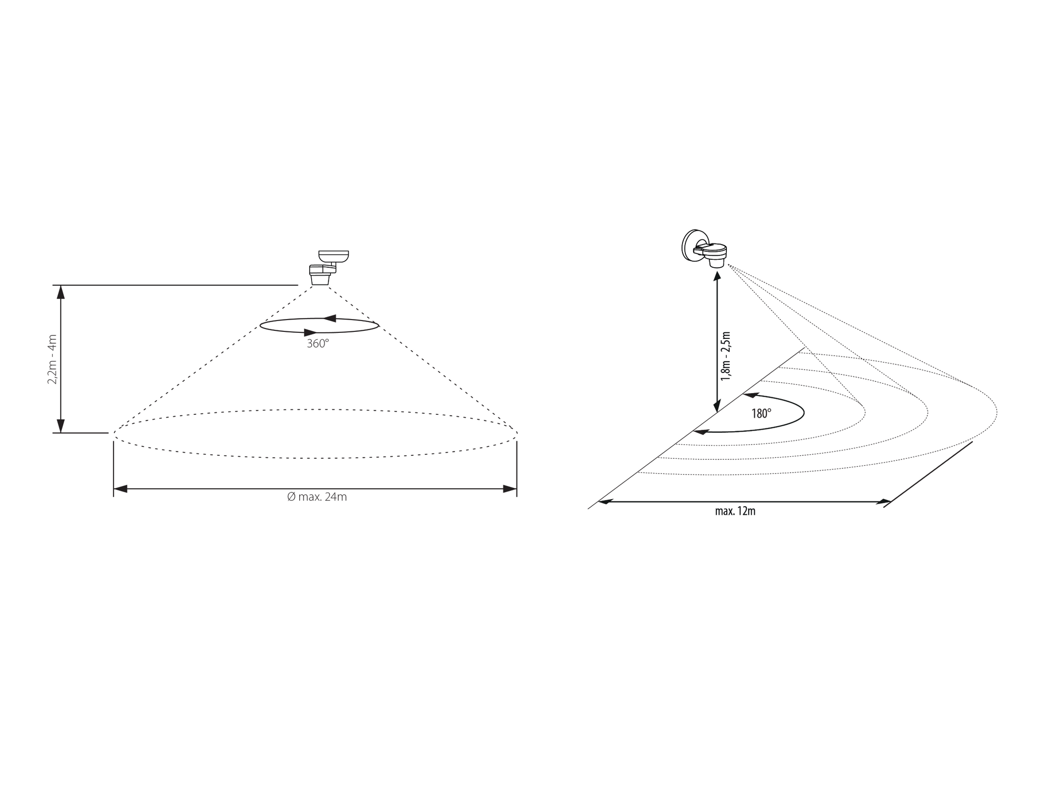 Detection range: | 10m - 24m (< 24°C)/ 360° 5m - 12m (< 24°C)/ 180° |