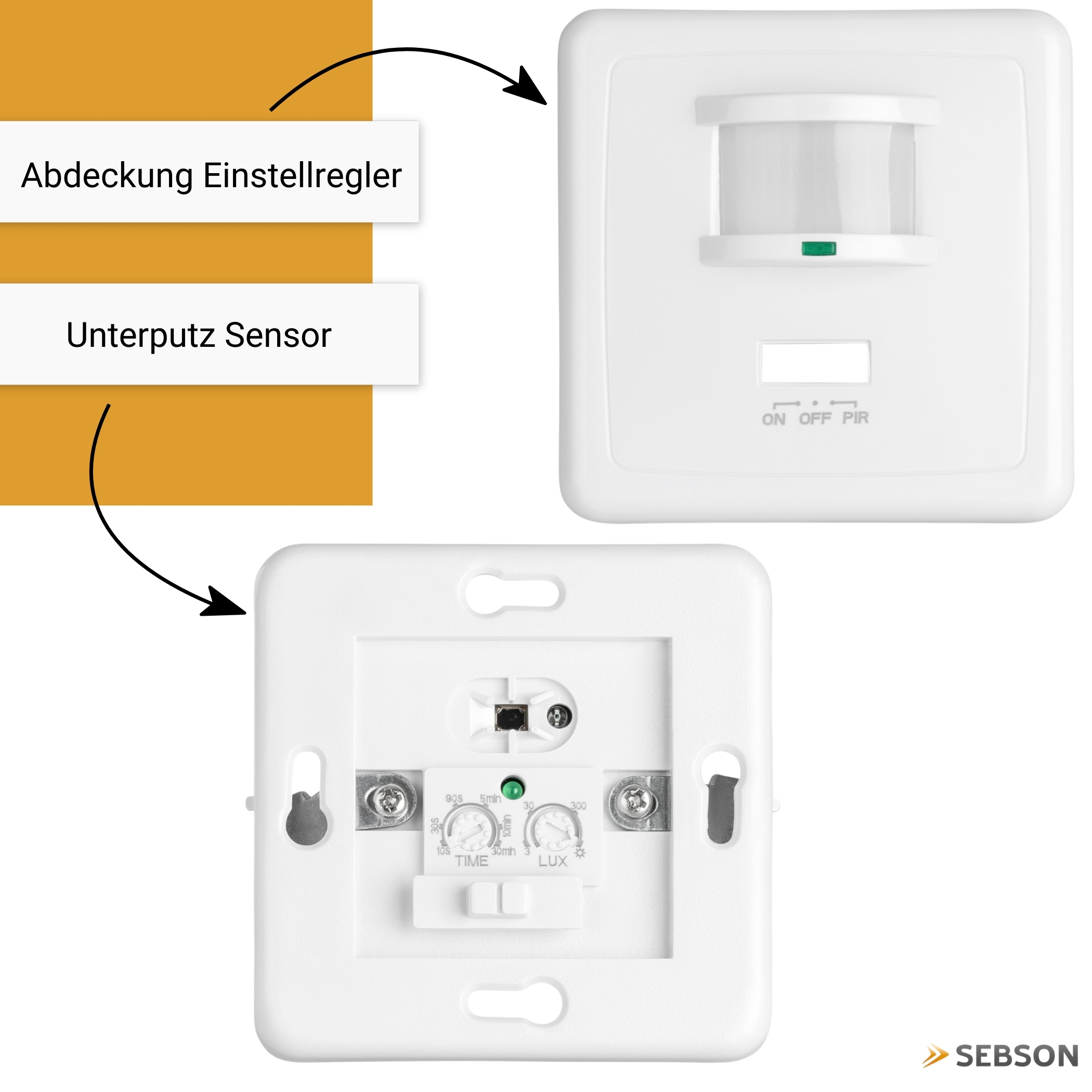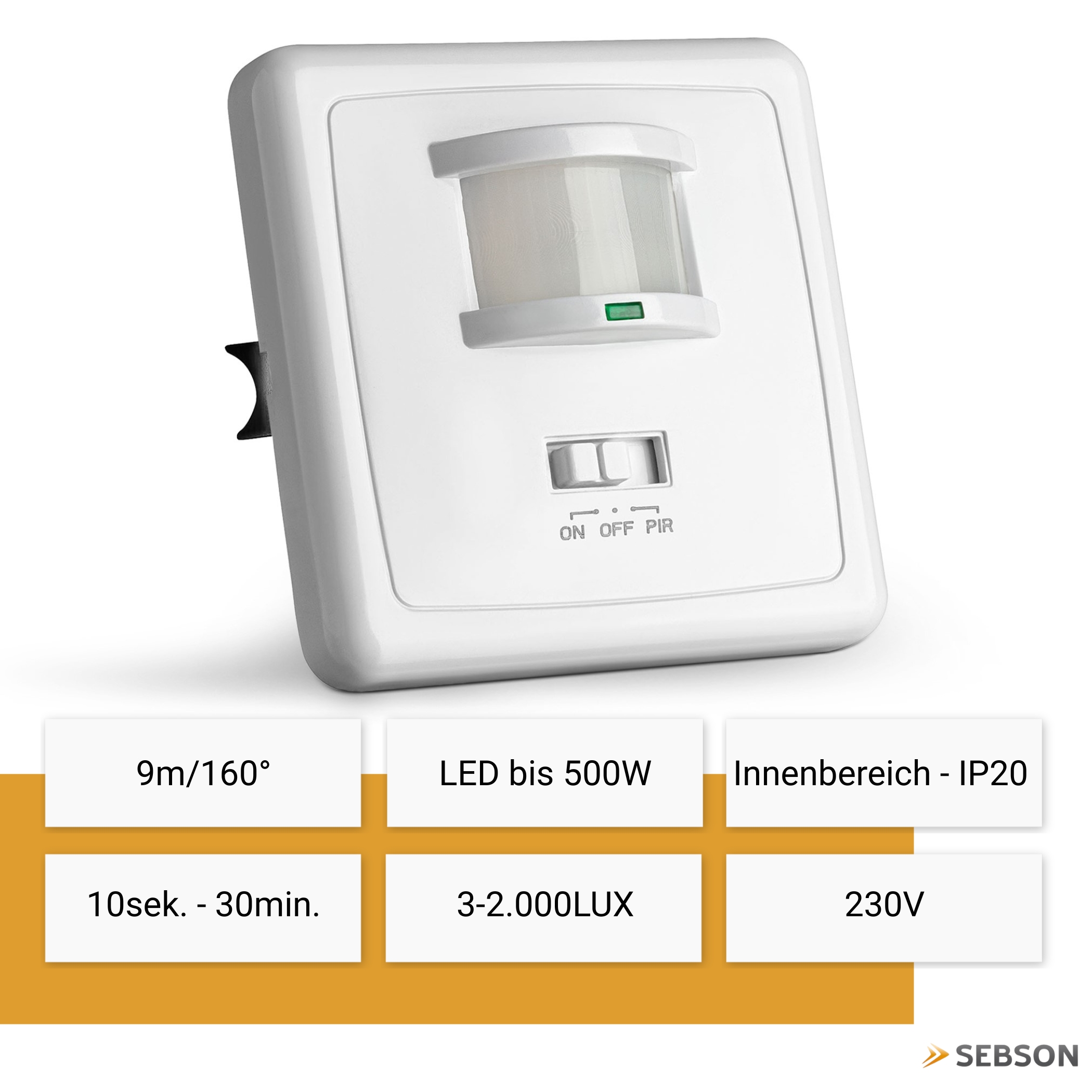 Flush-mounted, range max. 9m/160° max. 1200/500W, IP20, manual switch