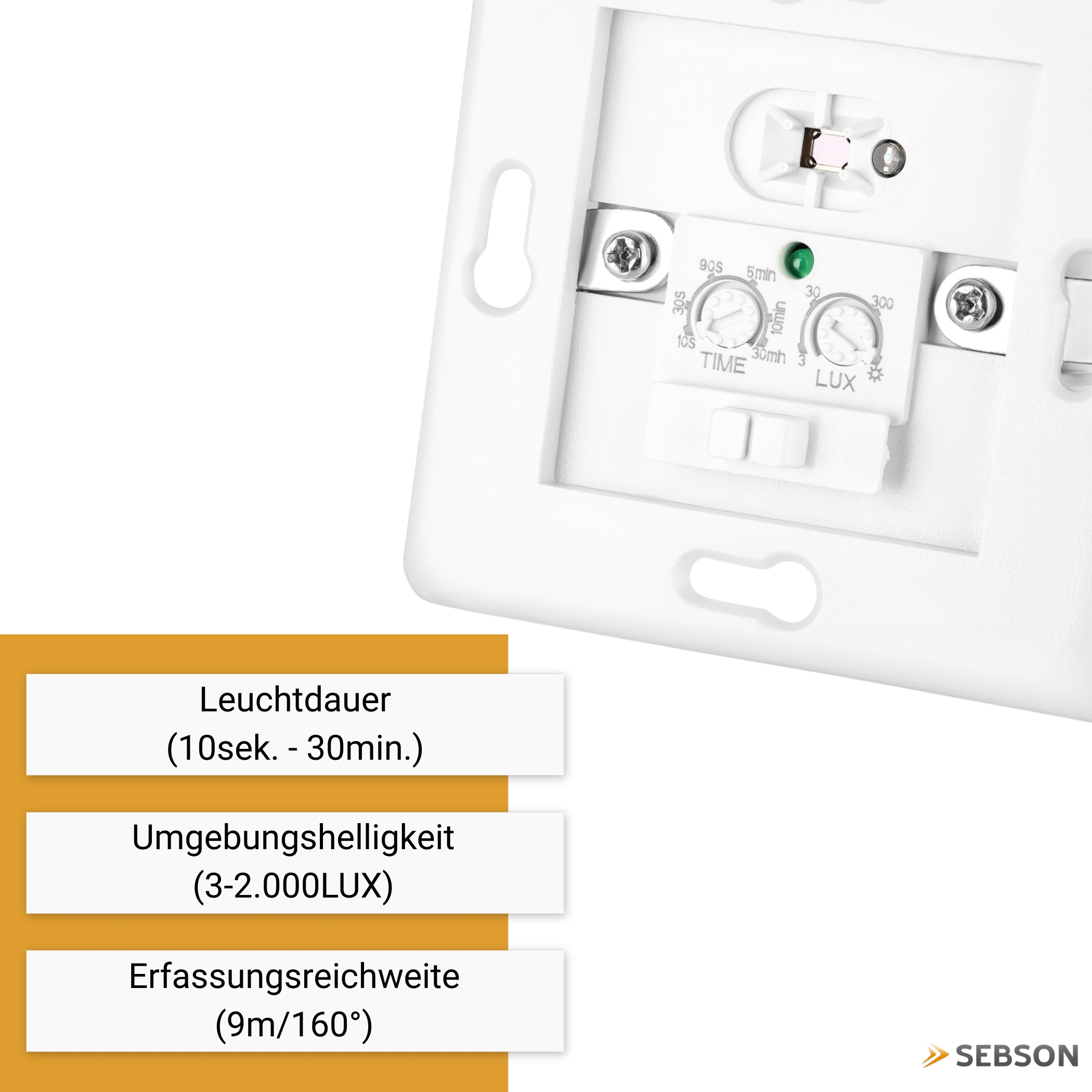 With this motion detector, you have variable switching options: Manual switching on and off or switching on when moving and switching off according to the time schedule. The infrared sensor detects movements of persons, large animals and vehicles in a detection range of up to 9m at a detection angle of 160° and switches on the connected lighting. After a preset time of approx. 10 seconds to 30 minutes, the motion detector switches off again. With the help of a controller, the switch-on sensitivity of this device can be regulated depending on the ambient brightness (in the range between 3 and 2,000 LUX).