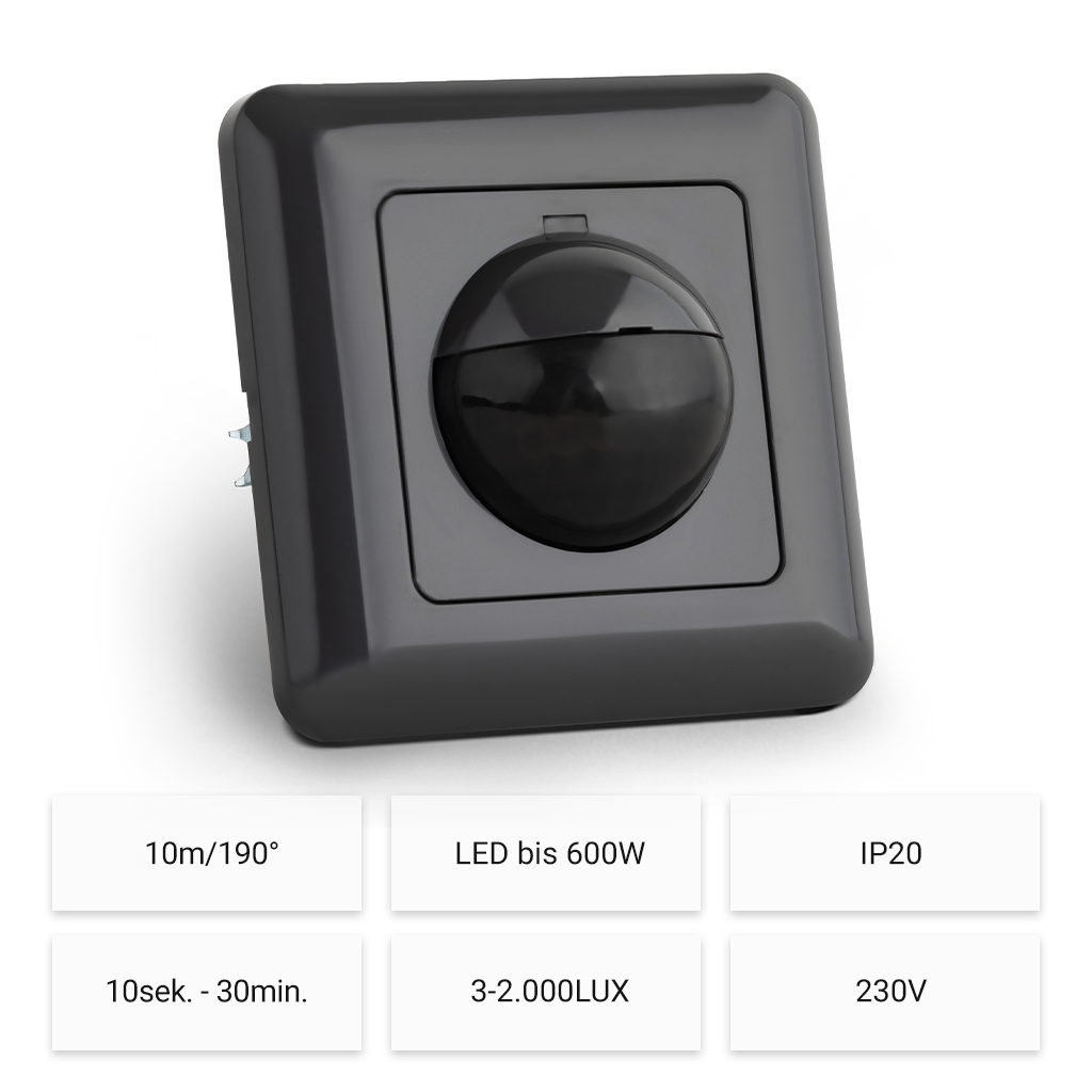Flush-mounted, range max. 10m/190°, max. 1200W/ 600W, IP20, 3-Wire