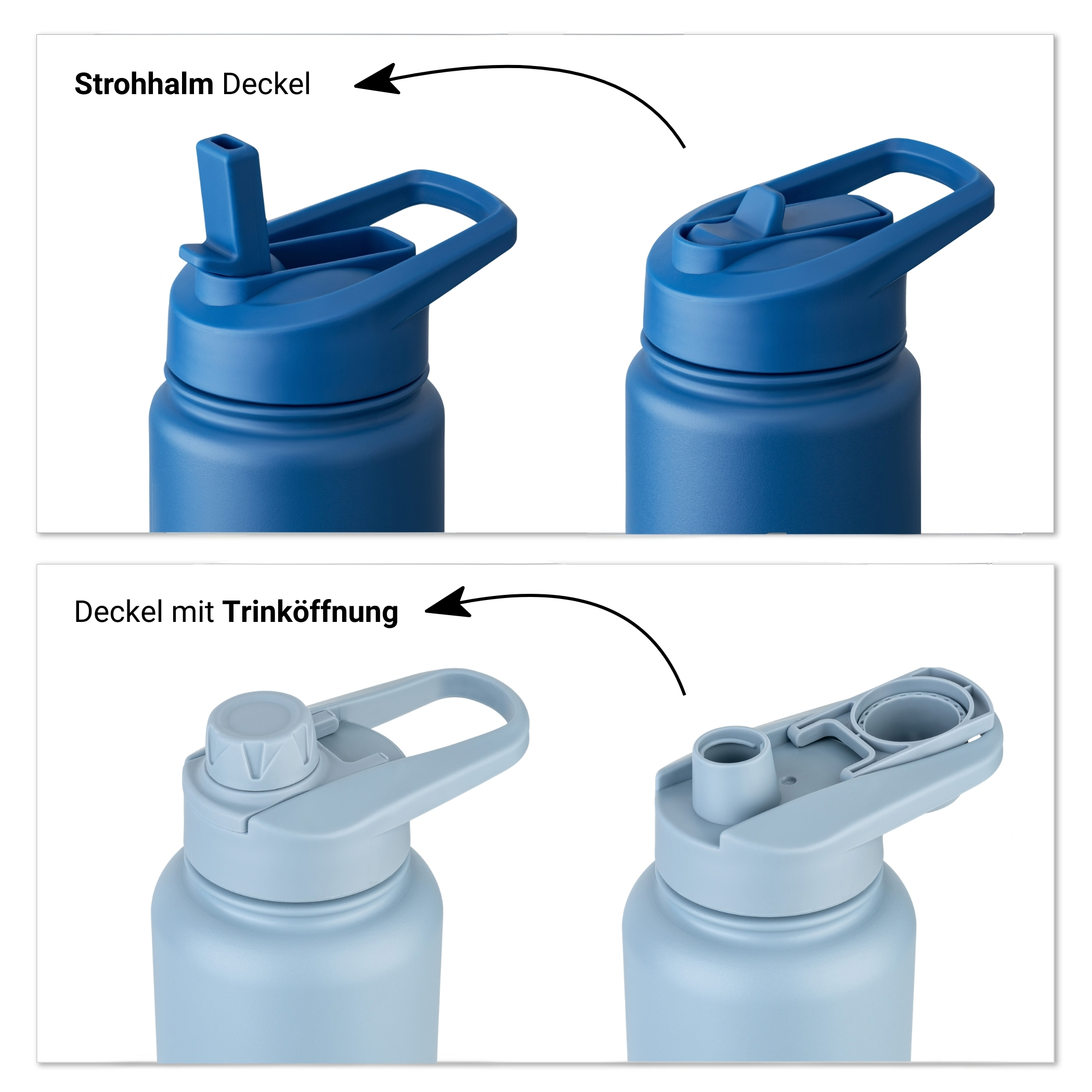 The thermal bottle comes with two leak proof lids to suit your individual preferences. The first lid has a generous drinking opening. Perfect for a quick sip during training. The second lid has a flip-up straw to give you extra convenience on the go.