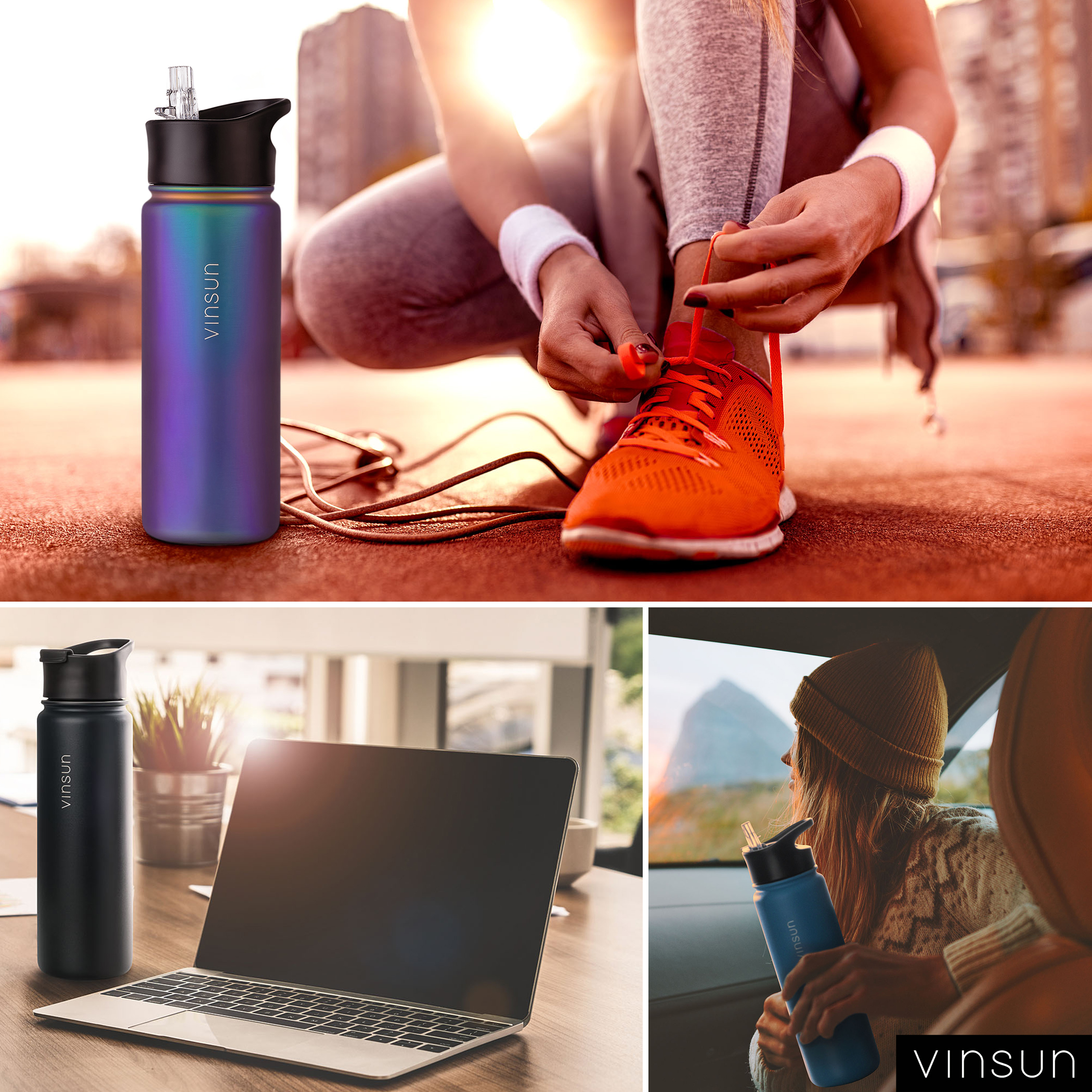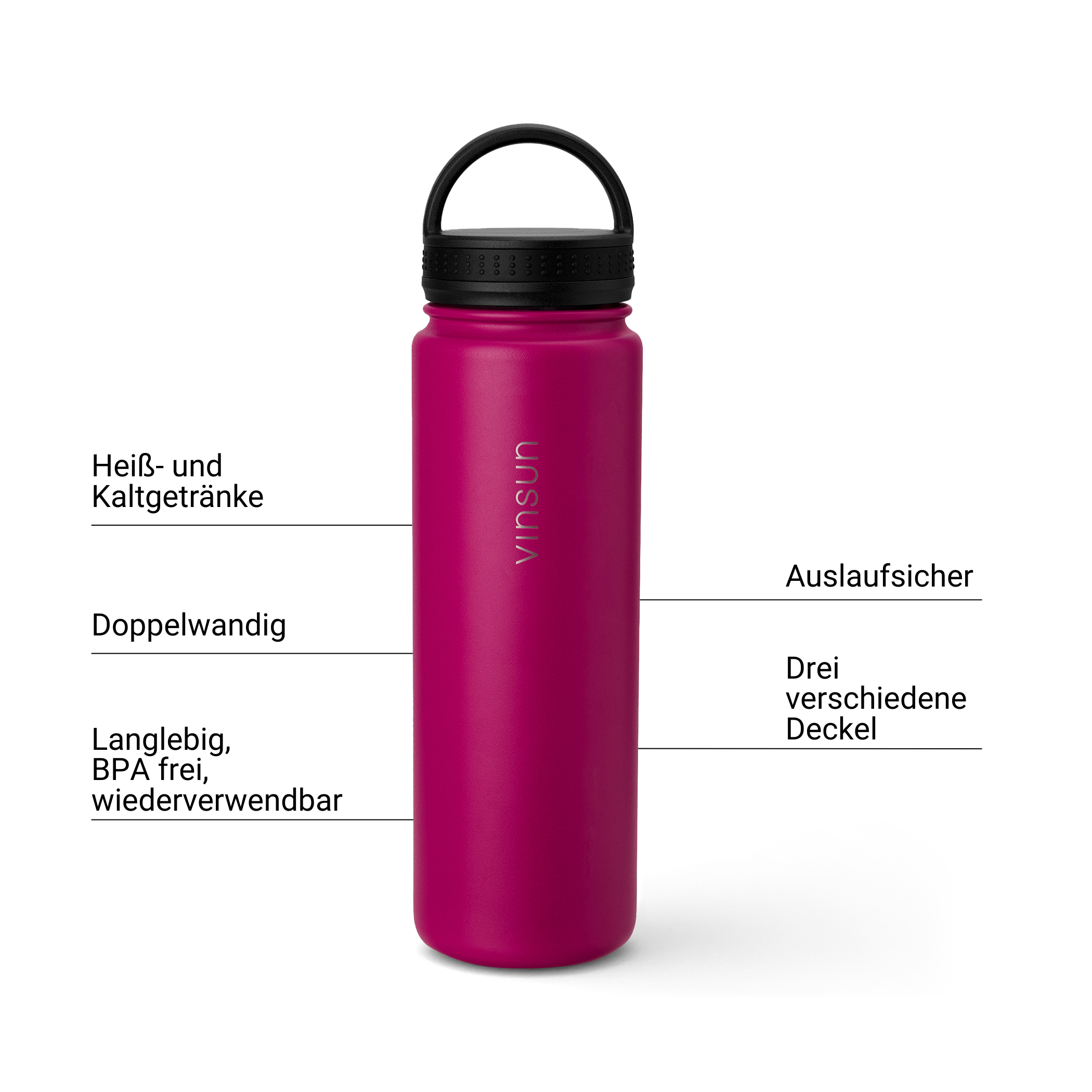 Eco-friendly and sustainable drinking bottle ideal for sparkling water, soft drinks, tea or coffee, whether hot or cold. Enjoy your drink in a modern, dynamic design with the drinking bottle by Vinsun. With this reusable stainless steel drinking bottle, you are optimally equipped for every occasion - sports, school, university, bicycle, leisure - A perfect companion!