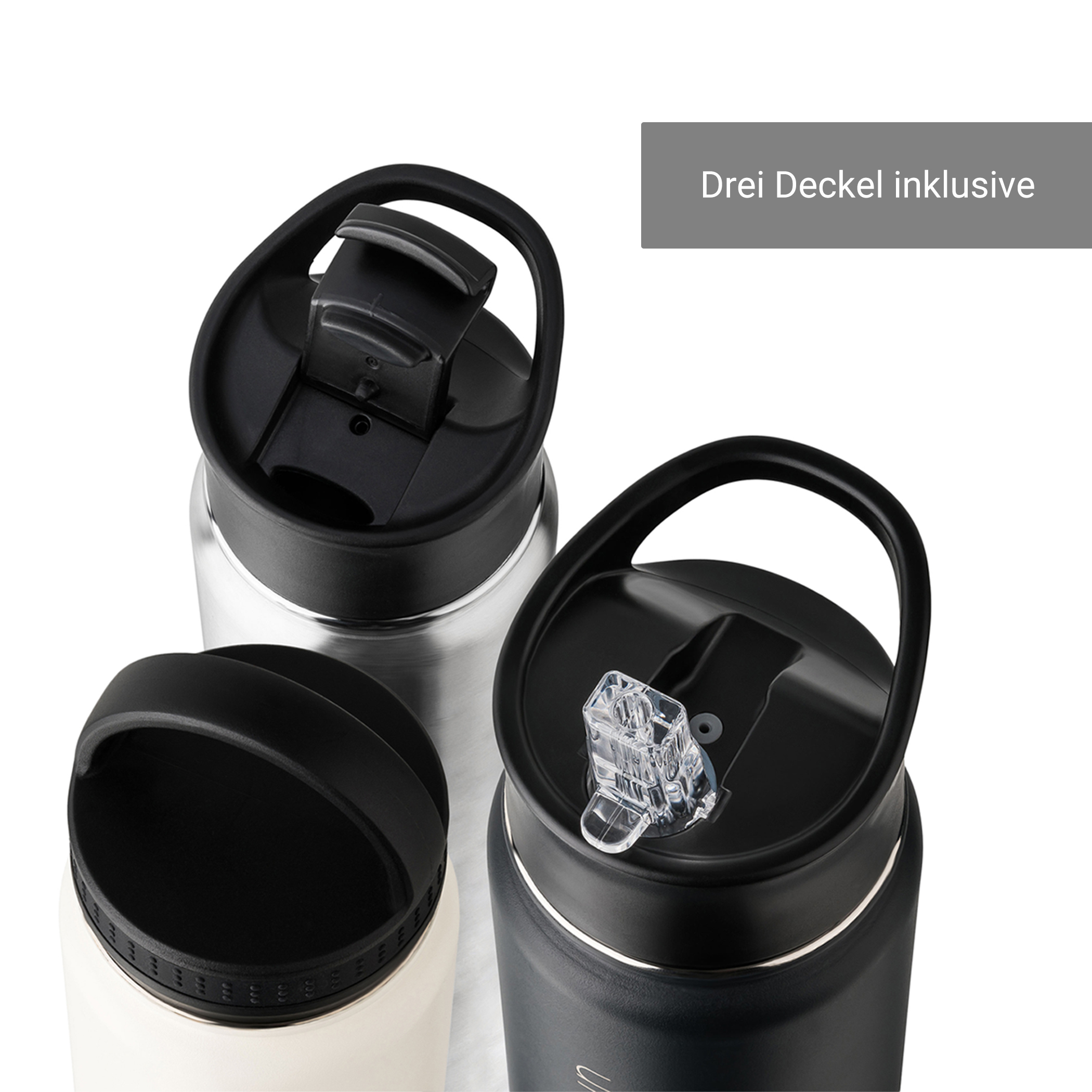 Drinking bottle made of sustainable stainless steel with three lids