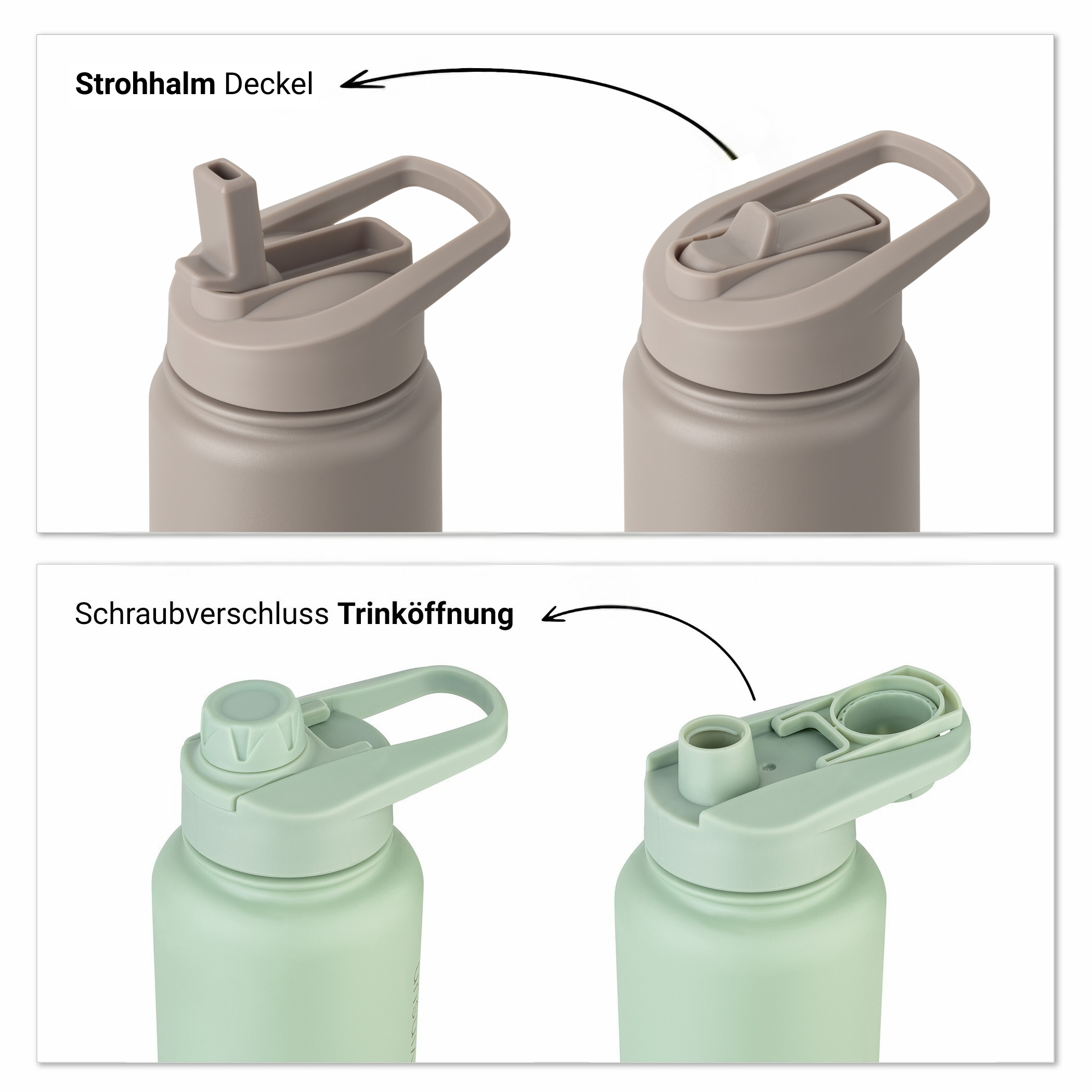The thermal bottle comes with two leak proof lids to suit your individual preferences. The first lid has a generous drinking opening. Perfect for a quick sip during training. The second lid has a flip-up straw to give you extra convenience on the go.