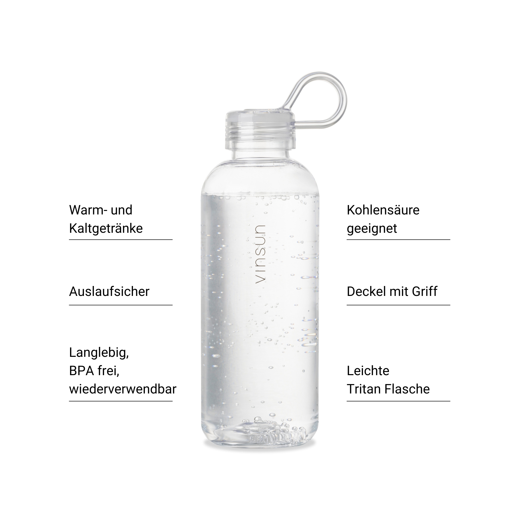 Vrsatile and practical drinking bottle made from BPA-free Tritan. Ideal for sparkling water, soft drinks or tea, whether hot or cold. Enjoy your drink in a modern, minimalist design with the drinking bottle from Vinsun. With this reusable drinking bottle made of Tritan, you are perfectly equipped for every occasion - sport, school, university, cycling, leisure - a perfect companion!