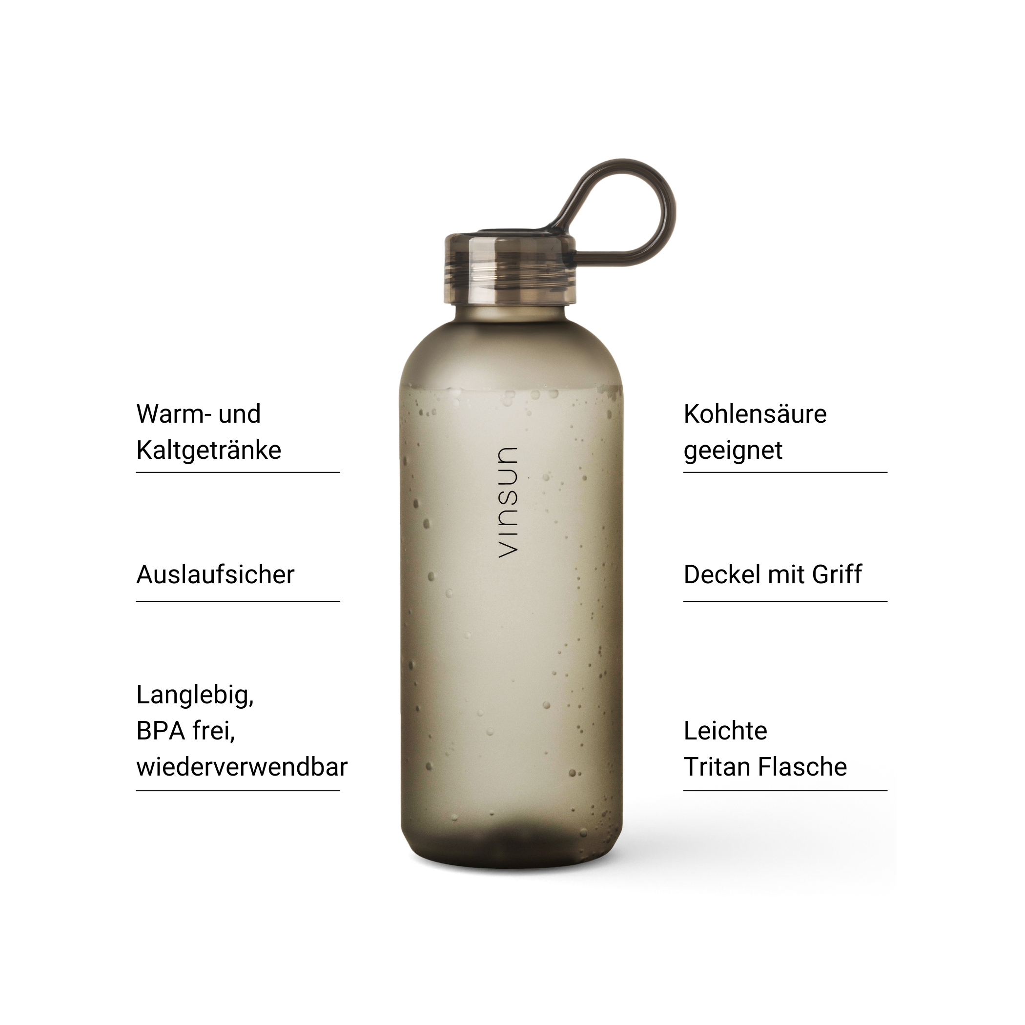 Vrsatile and practical drinking bottle made from BPA-free Tritan. Ideal for sparkling water, soft drinks or tea, whether hot or cold. Enjoy your drink in a modern, minimalist design with the drinking bottle from Vinsun. With this reusable drinking bottle made of Tritan, you are perfectly equipped for every occasion - sport, school, university, cycling, leisure - a perfect companion!
