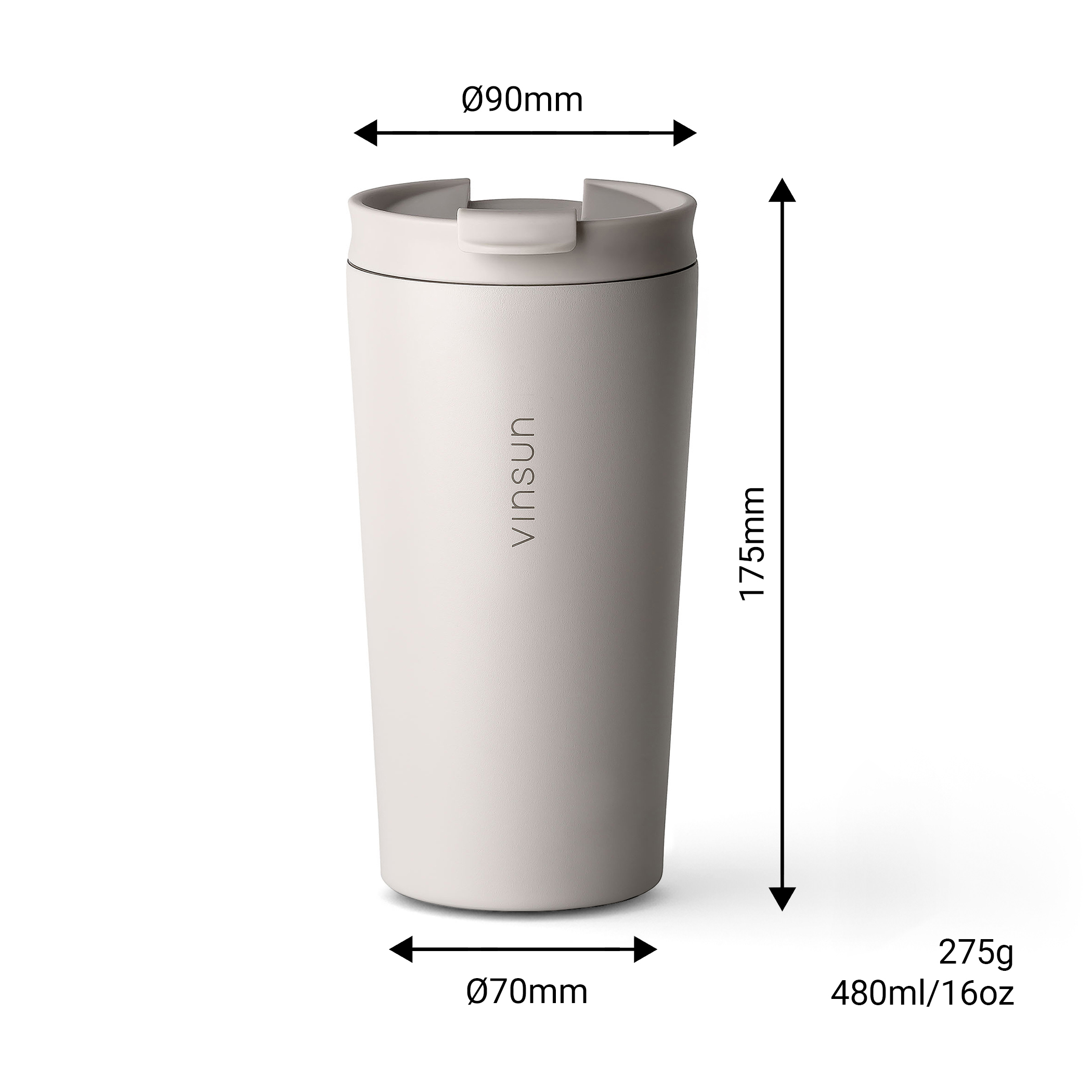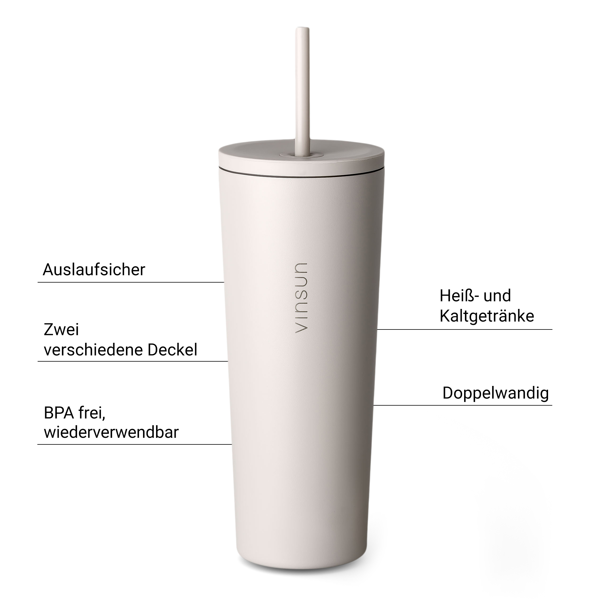 The thermo mug from Vinsun is the perfect solution for anyone who does not want to miss out on their hot or cold drinks when travelling. With a capacity of 480ml and two different lids, a classic lid with drinking opening and a straw lid, this stainless steel mug offers maximum flexibility and convenience.