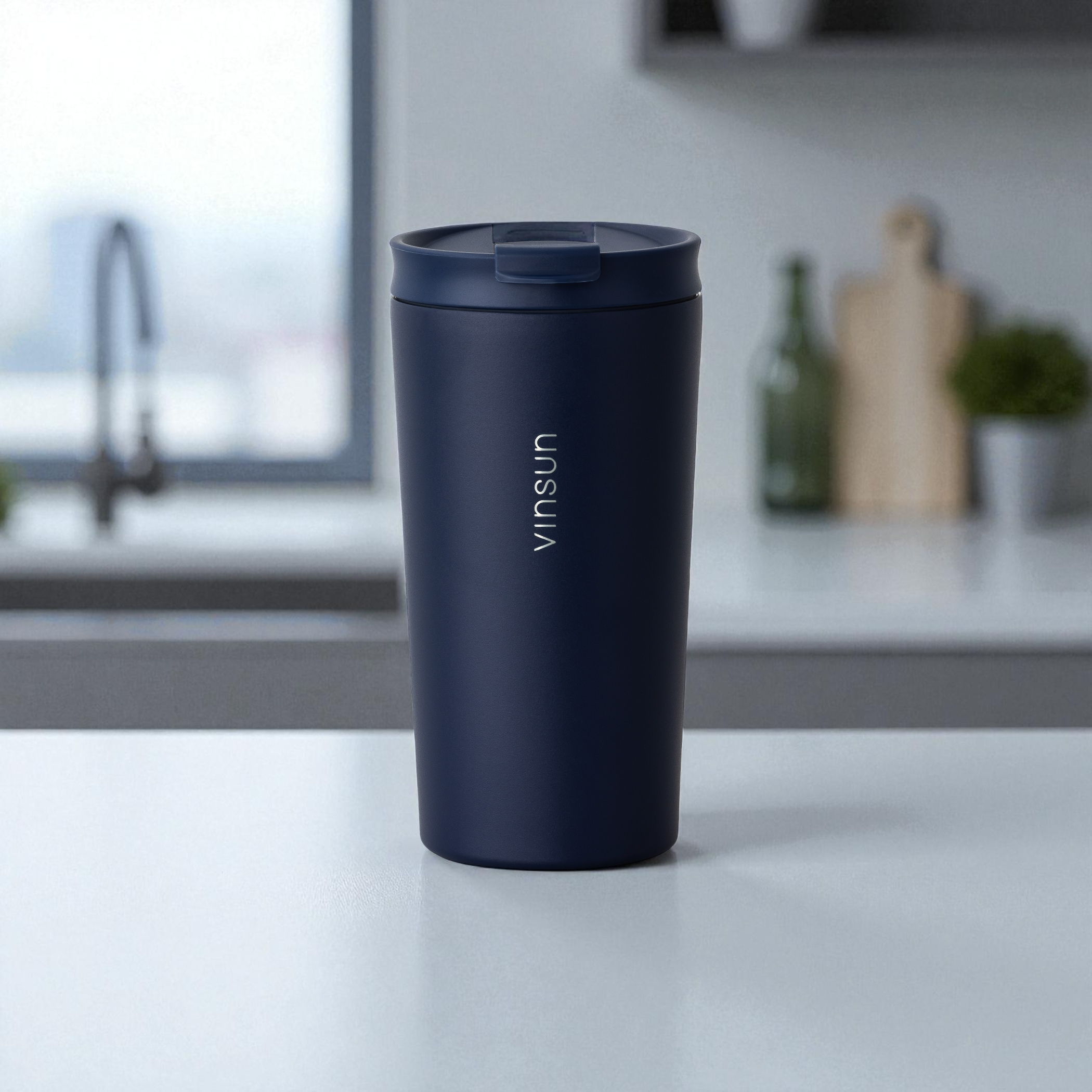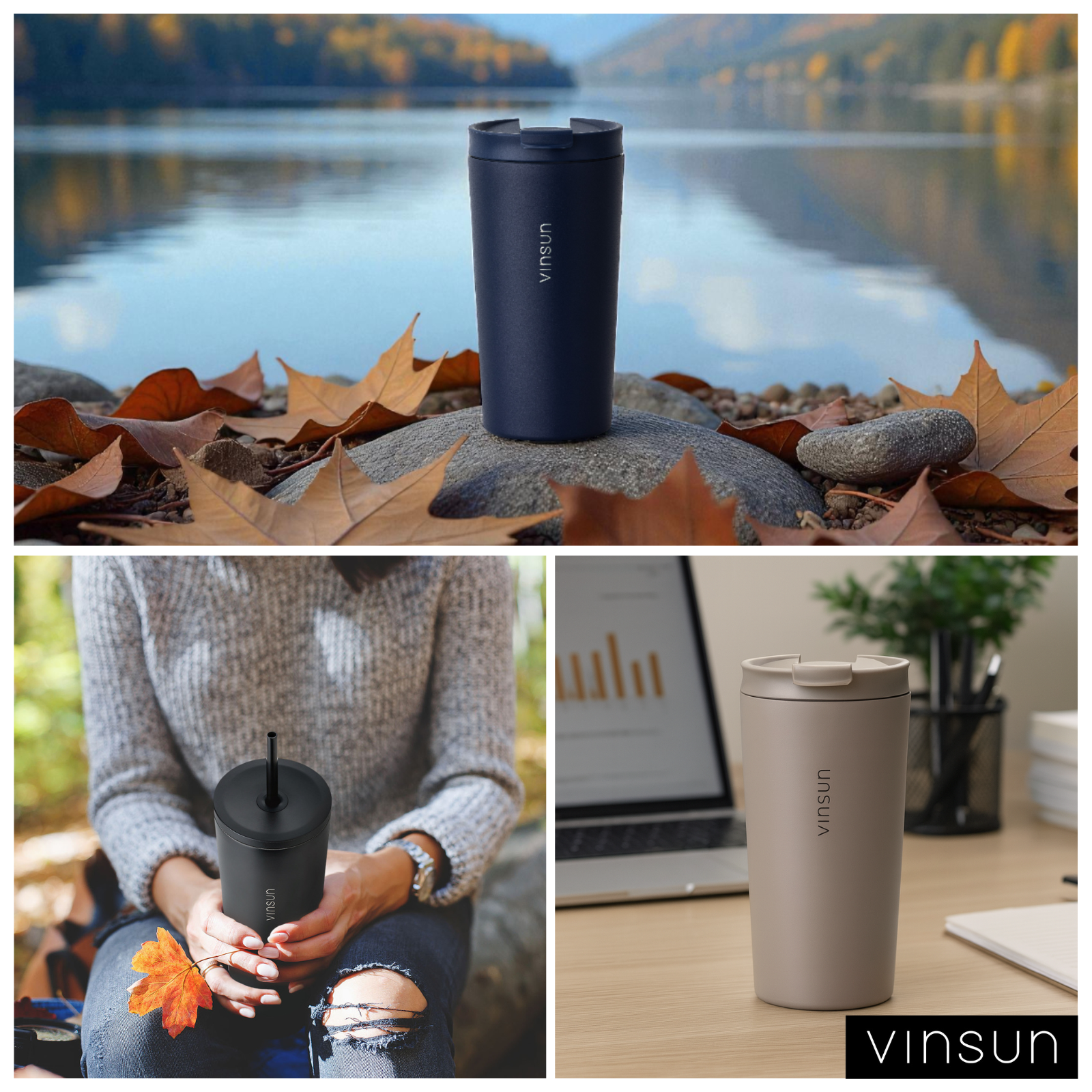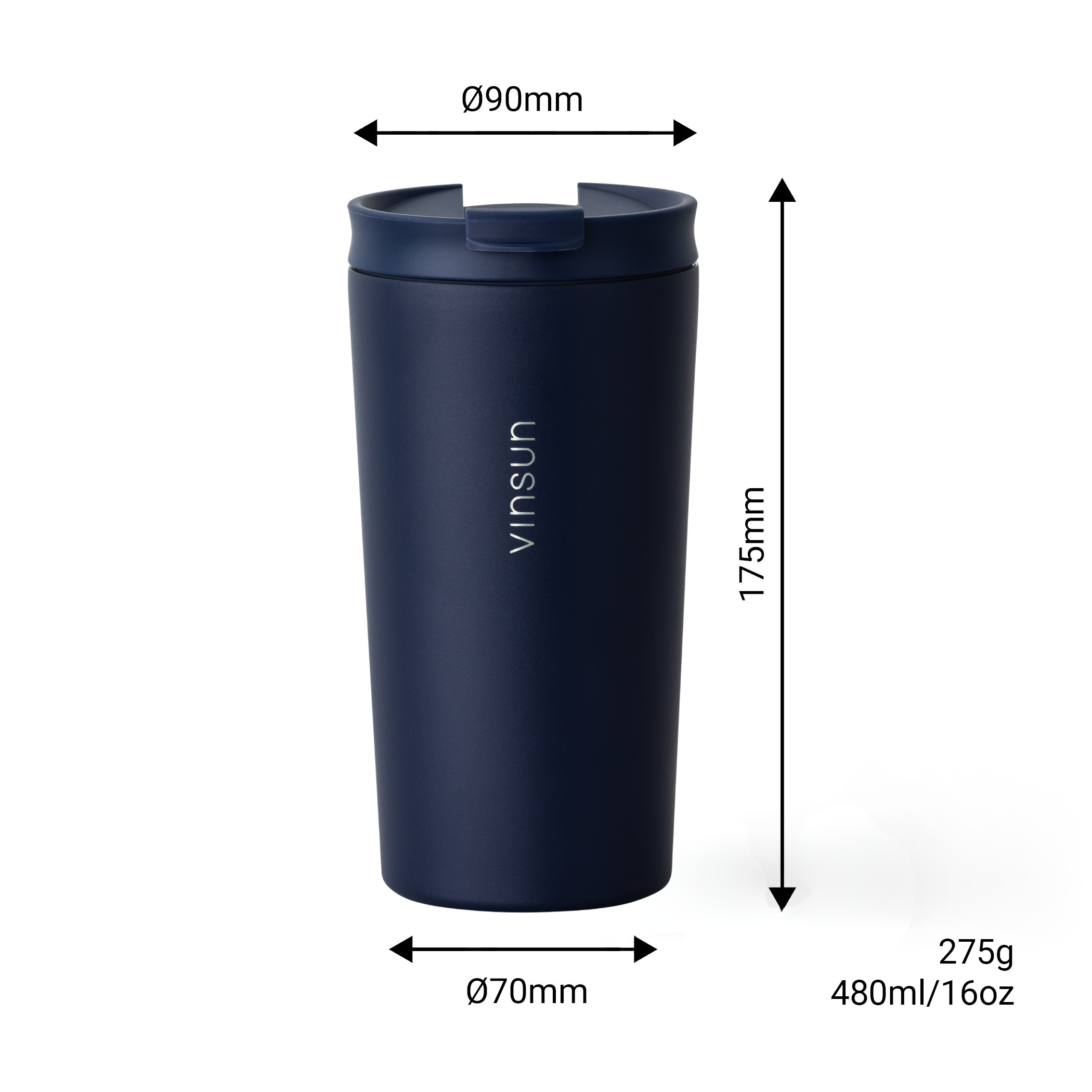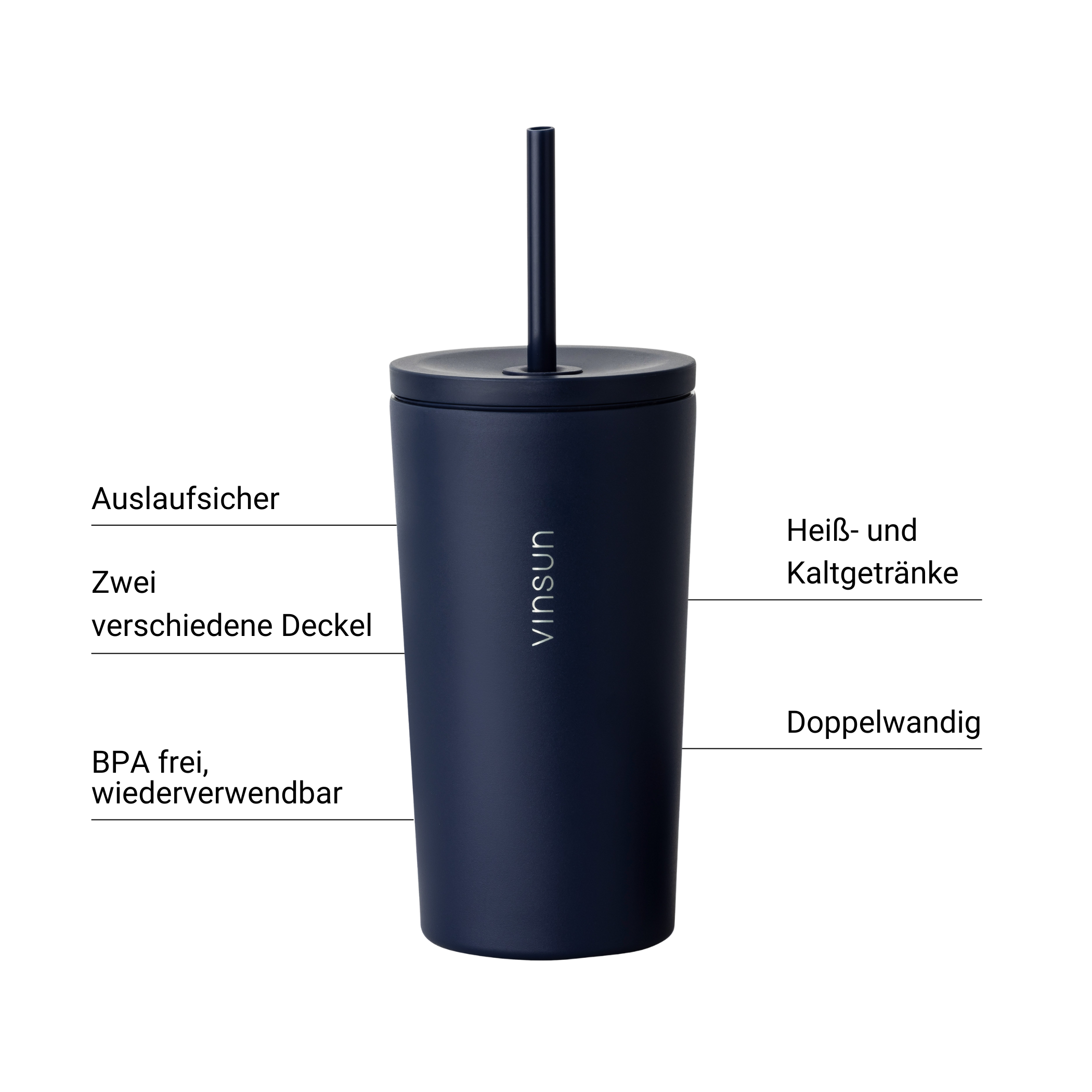 The thermo mug from Vinsun is the perfect solution for anyone who does not want to miss out on their hot or cold drinks when travelling. With a capacity of 480ml and two different lids, a classic lid with drinking opening and a straw lid, this stainless steel mug offers maximum flexibility and convenience.