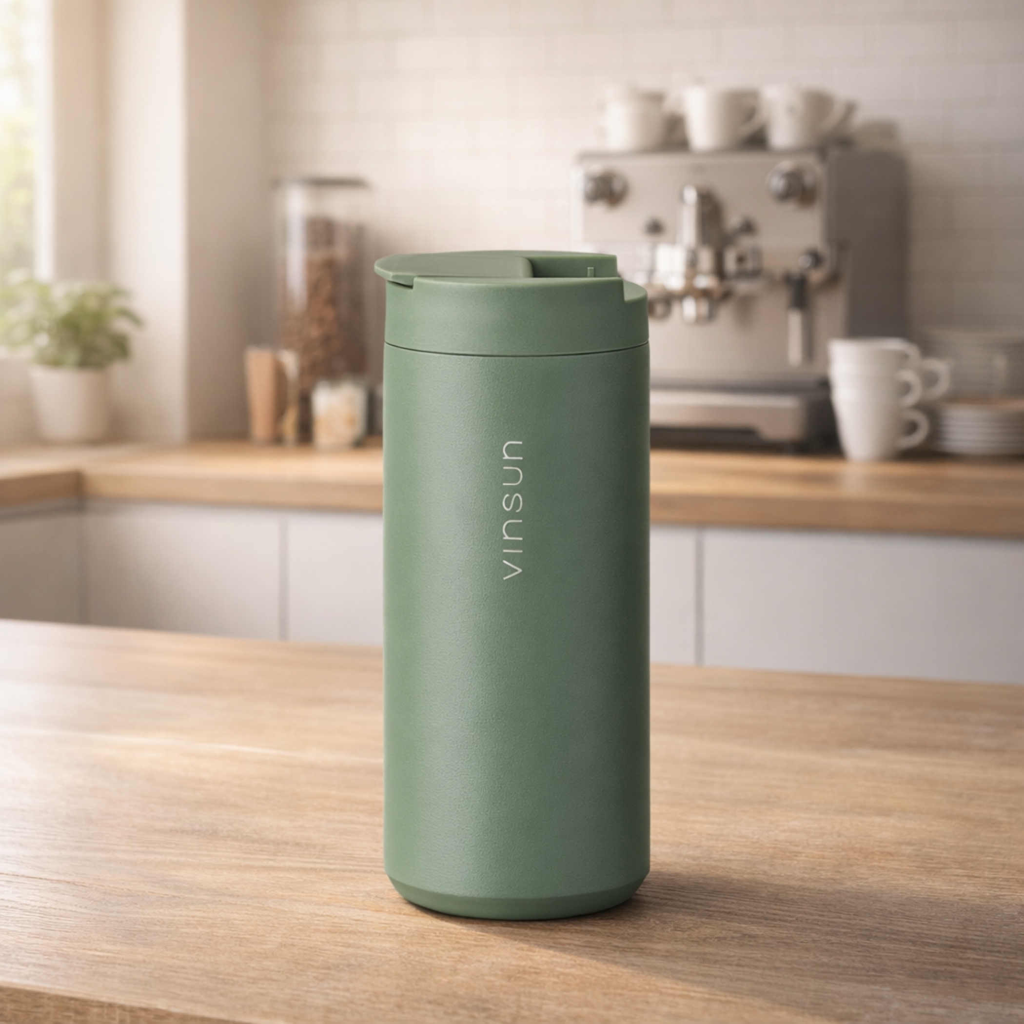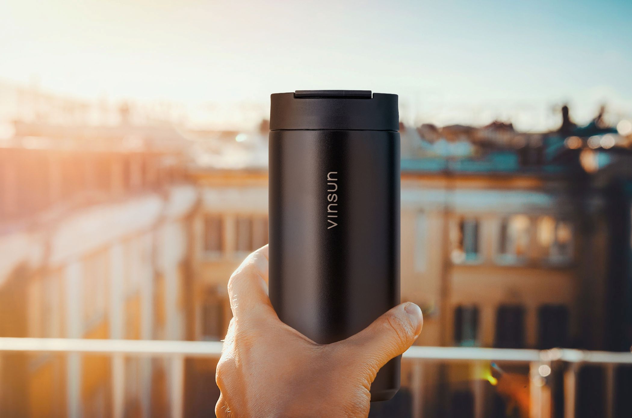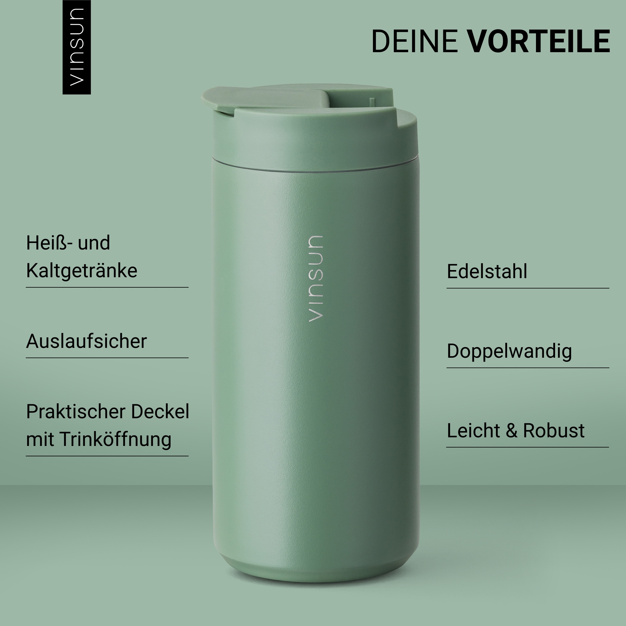 Environmentally friendly and sustainable drinking mug ideal for coffee or tea, whether hot or cold. Enjoy your drink in a modern, dynamic design with the thermo mug by Vinsun. With this reusable stainless steel thermo mug, you are optimally equipped for any occasion - travel, university, work, leisure - A perfect companion!