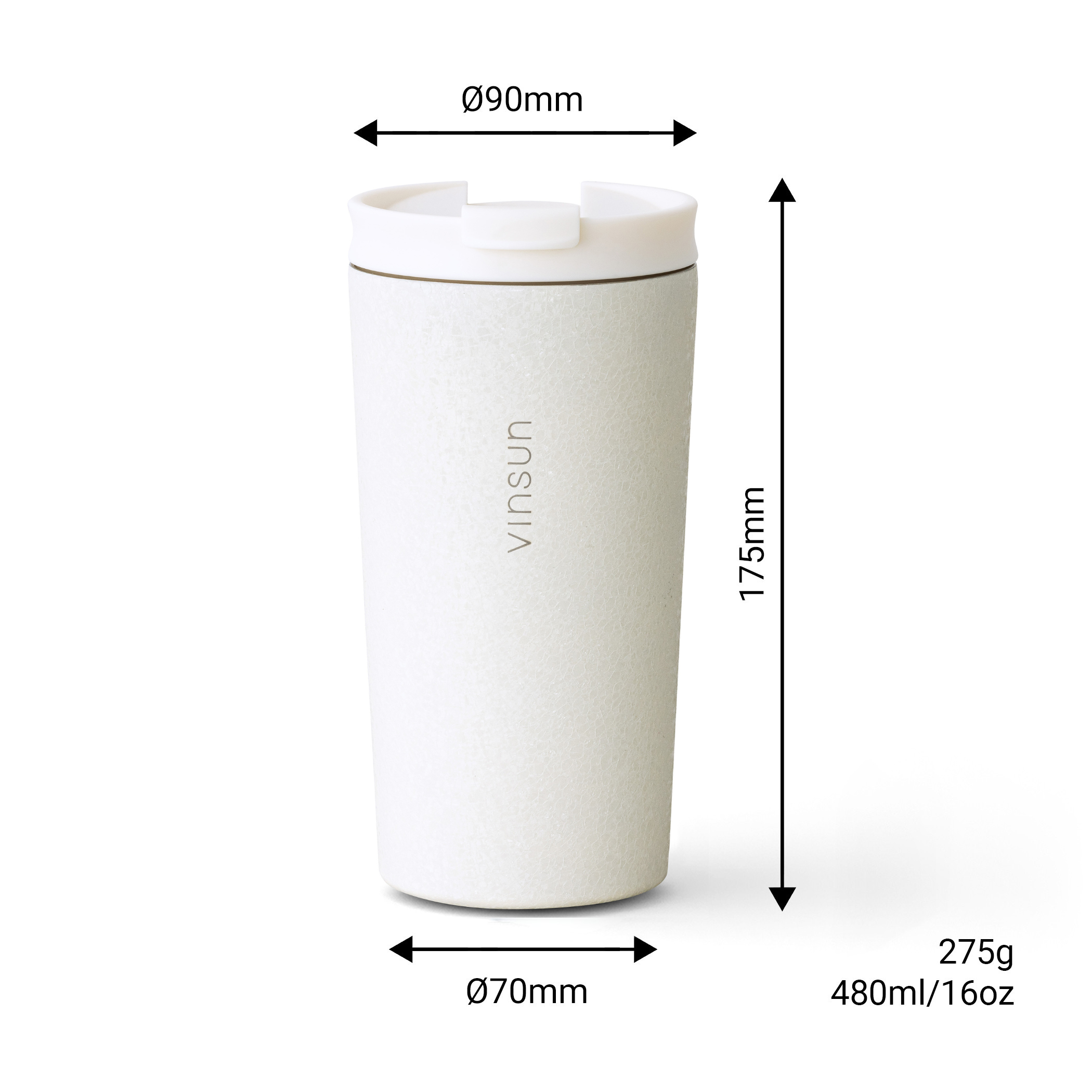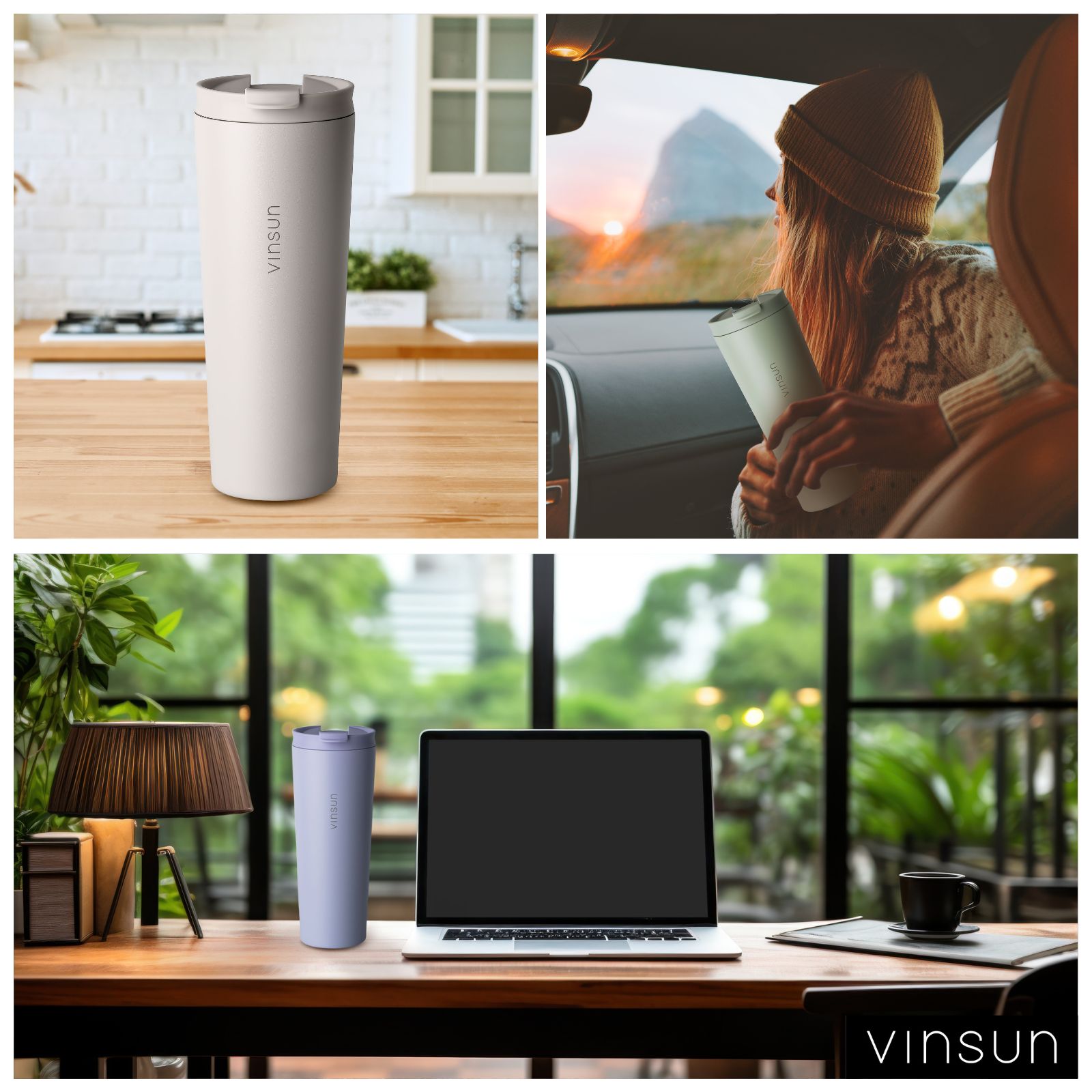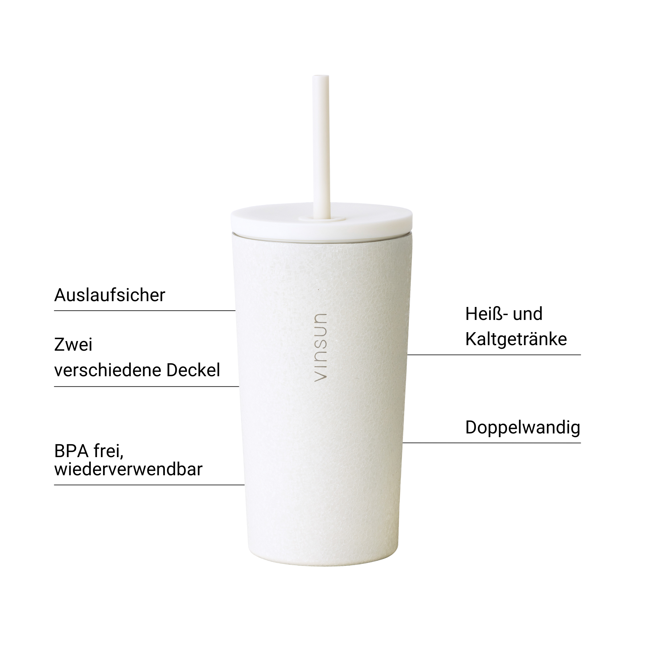 The thermo mug from Vinsun is the perfect solution for anyone who does not want to miss out on their hot or cold drinks when travelling. With a capacity of 480ml and two different lids, a classic lid with drinking opening and a straw lid, this stainless steel mug offers maximum flexibility and convenience.