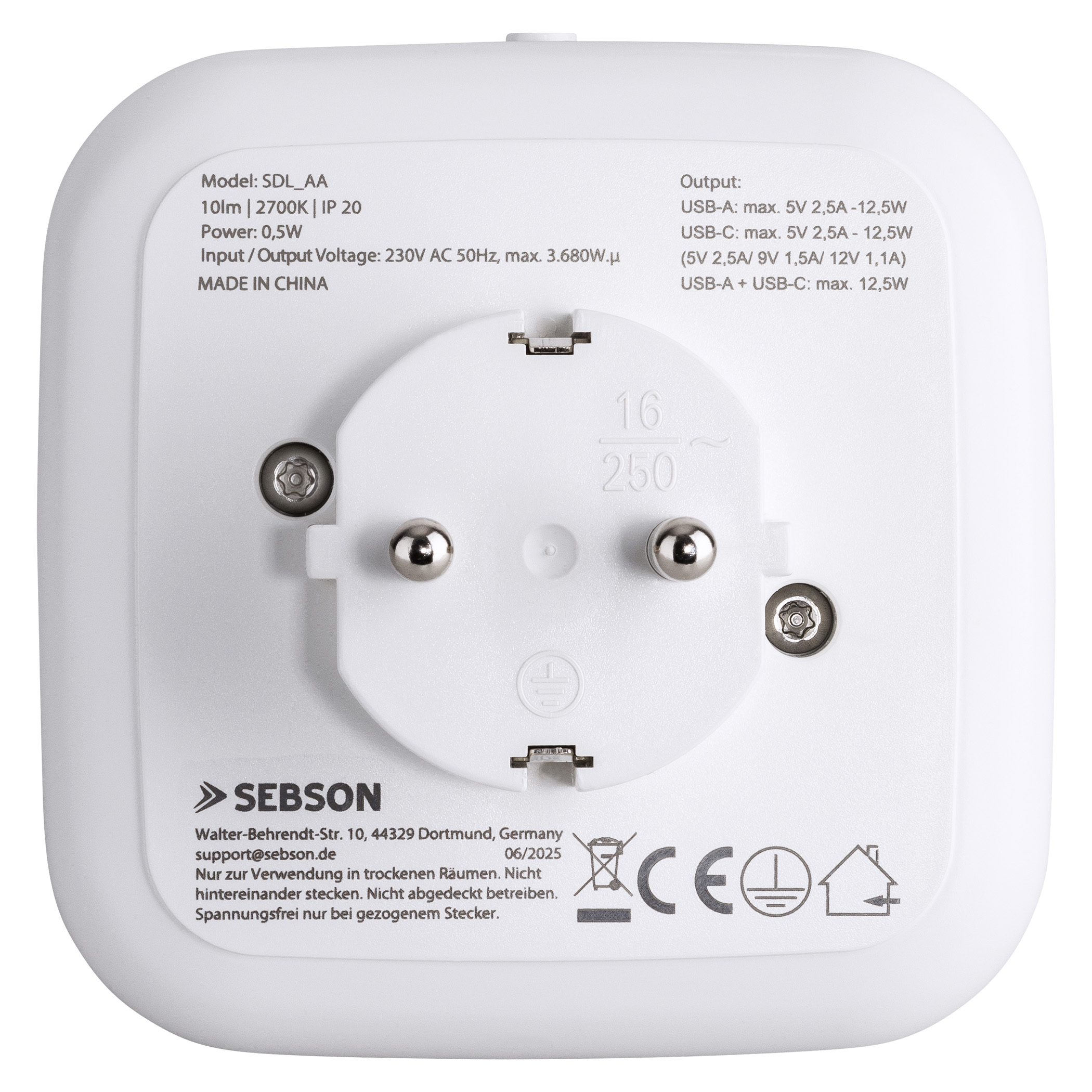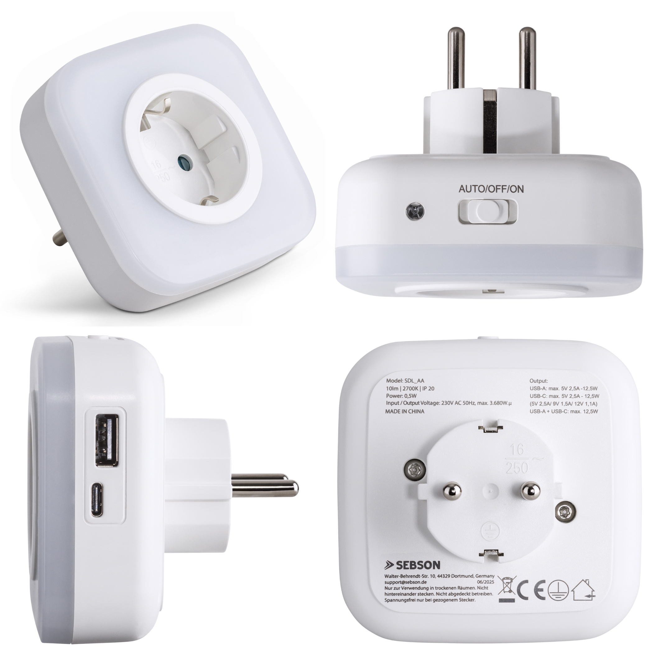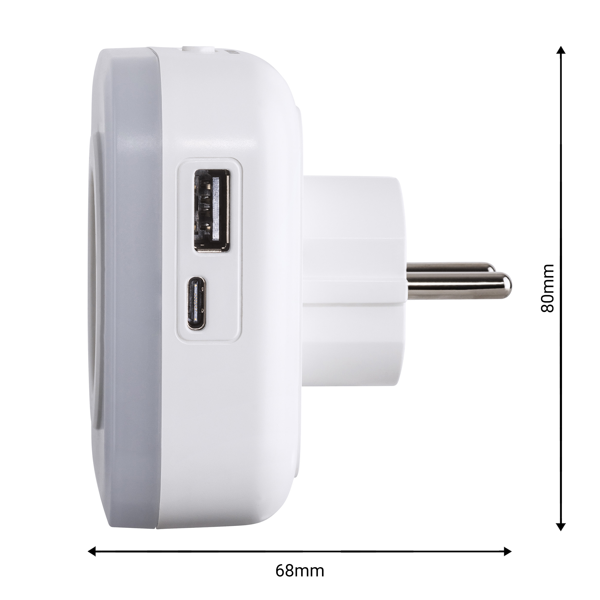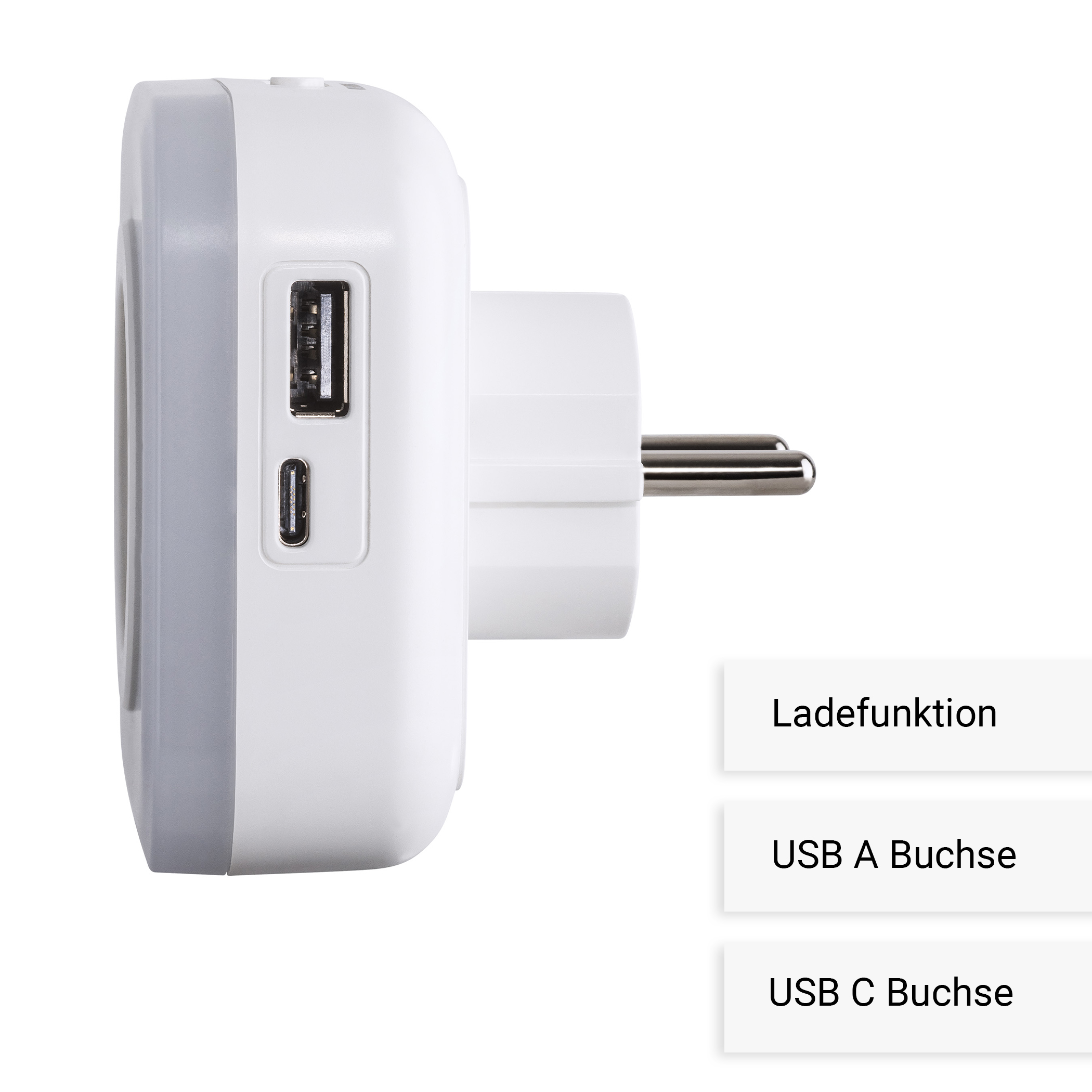 In addition, the night light has integrated USB-A and USB-C ports so that smartphones, tablets, or other devices can be conveniently charged. The practical adapter function allows you to connect additional electronic devices with a power rating of up to 3,680W.