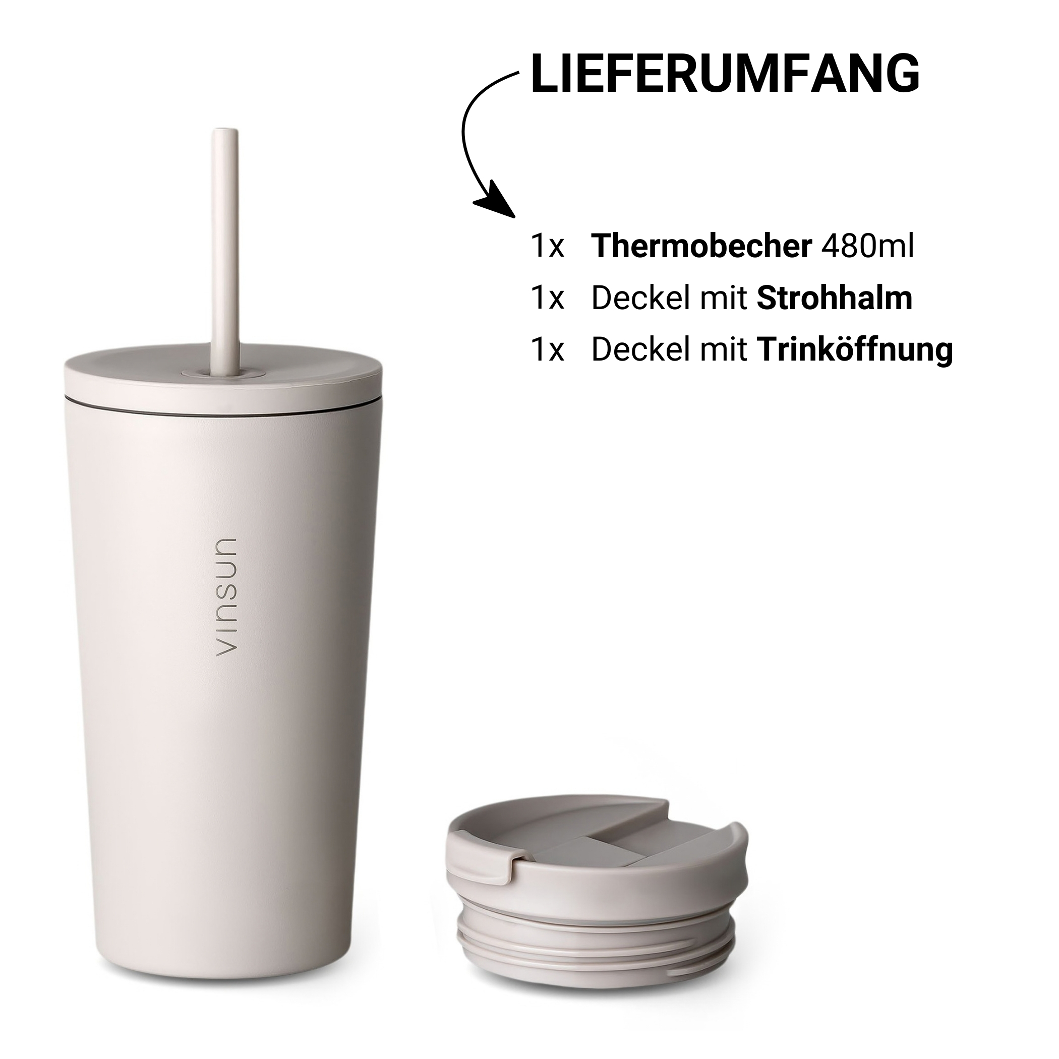 Der Thermobecher von Vinsun ist die perfekte Lösung für alle, die unterwegs nicht auf ihre heißen oder kalten Getränke verzichten möchten. Mit einer Füllmenge von 480ml und zwei verschiedenen Deckeln, einem klassischen Deckel mit Trinköffnung sowie einem Strohhalmdeckel, bietet dieser Edelstahl Becher maximale Flexibilität und Komfort.