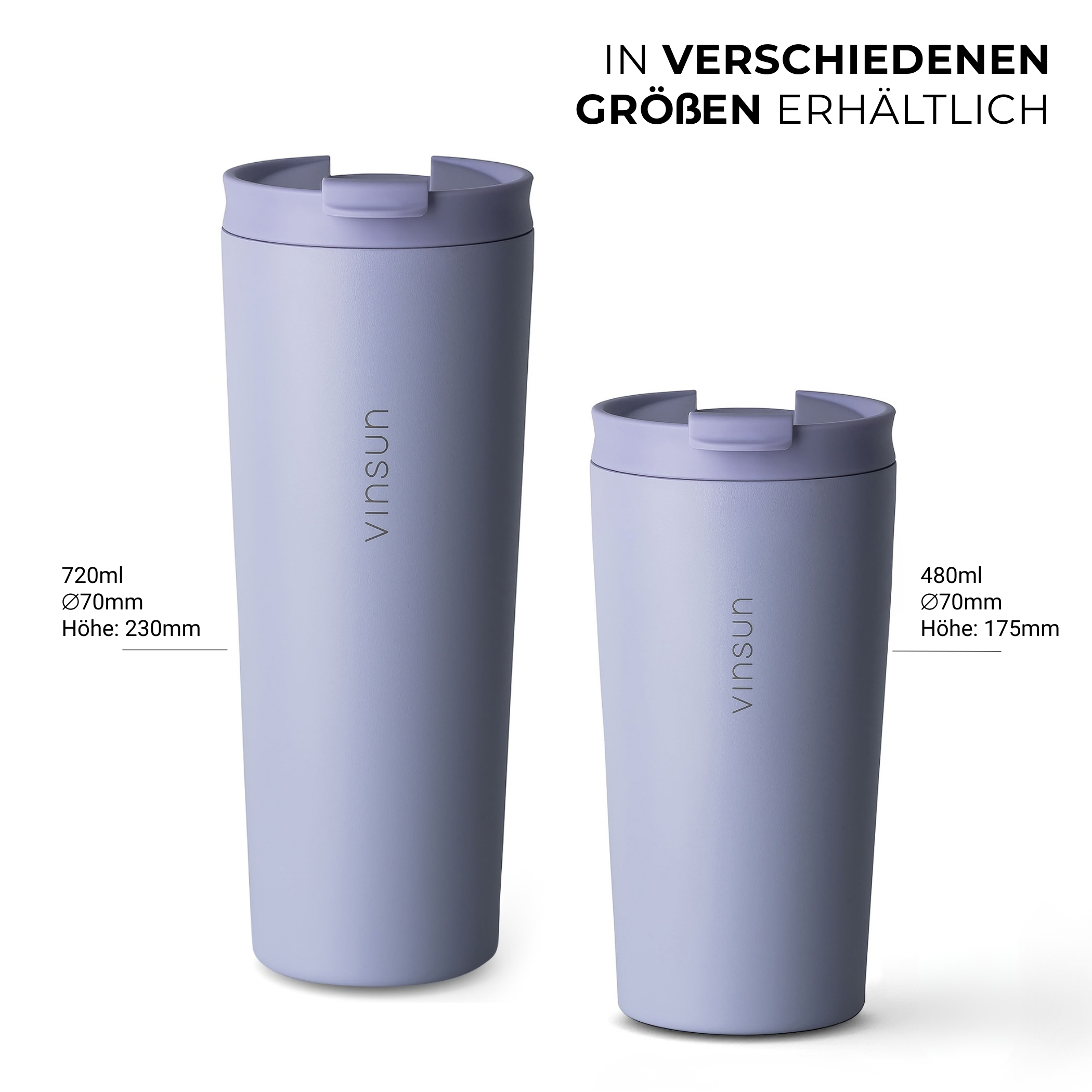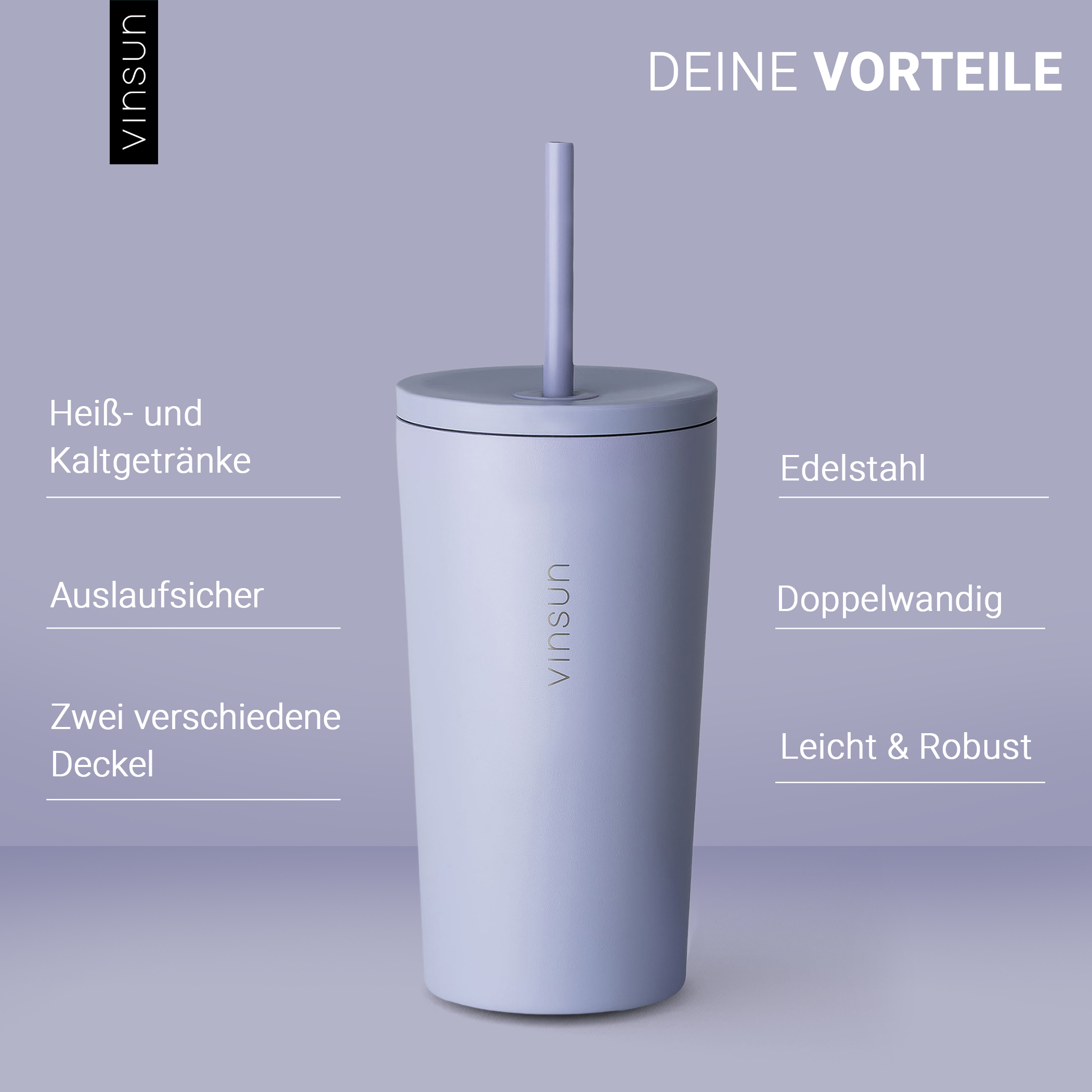 Der Thermobecher von Vinsun ist die perfekte Lösung für alle, die unterwegs nicht auf ihre heißen oder kalten Getränke verzichten möchten. Mit einer Füllmenge von 480ml und zwei verschiedenen Deckeln, einem klassischen Deckel mit Trinköffnung sowie einem Strohhalmdeckel, bietet dieser Edelstahl Becher maximale Flexibilität und Komfort.