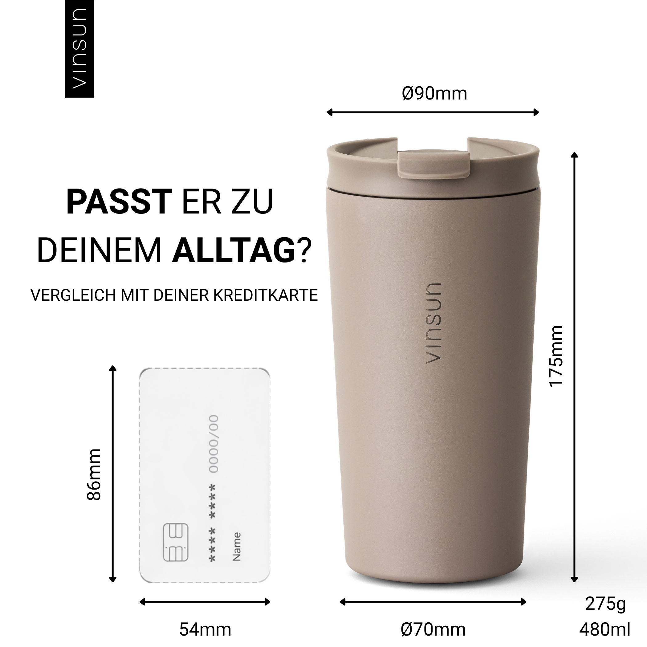 Der Vinsun Thermobecher aus Edelstahl bietet 480ml Fassungsvermögen. Die doppelwandige Isolierung hält Ihre Getränke stundenlang heiß oder kalt. Auslaufsicher und bruchfest, ist dieser Becher ideal für unterwegs. Mit zwei Deckeln – einem Deckel mit Trinköffnung und einem Strohhalm Deckel – passt er sich flexibel Ihren Bedürfnissen an. BPA frei, geschmacks- und geruchsneutral, bietet er eine langlebige Alternative zu Einwegbechern und Flaschen. Das minimalistische, moderne Design macht ihn außerdem zum stilvollen Begleiter. Einfache Handreinigung für eine langanhaltende Freude an diesem zuverlässigen Thermobecher.