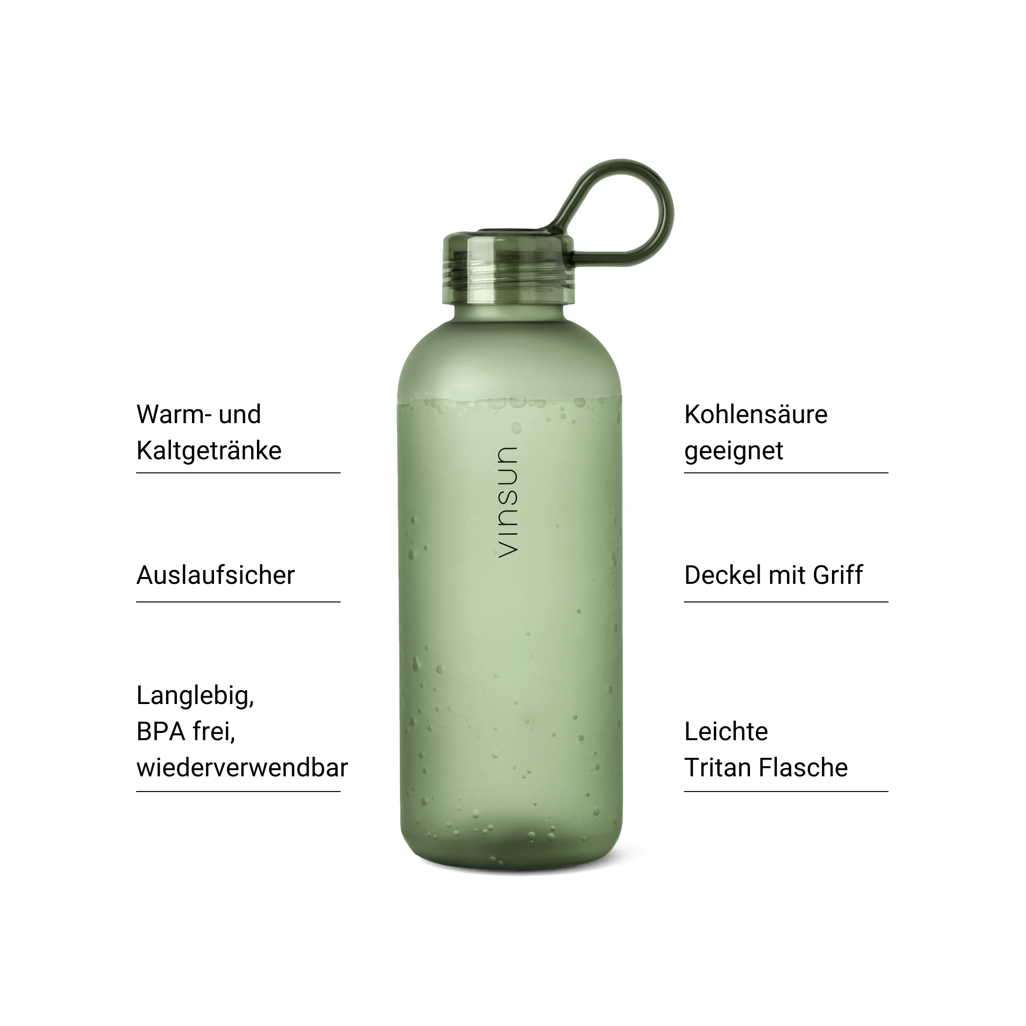 Vielseitige und praktische Trinkflasche aus BPA freiem Tritan. Ideal für Sprudelwasser, Softdrinks oder Tee, egal ob warm oder kalt. Genießen Sie Ihr Getränk in modernem, minimalistischen Design mit der Trinkflasche von Vinsun. Mit dieser wiederverwendbaren Trinkflasche aus Tritan sind Sie für jede Gelegenheit optimal ausgestattet - Sport, Schule, Uni, Fahrrad, Freizeit - Ein perfekter Begleiter!
