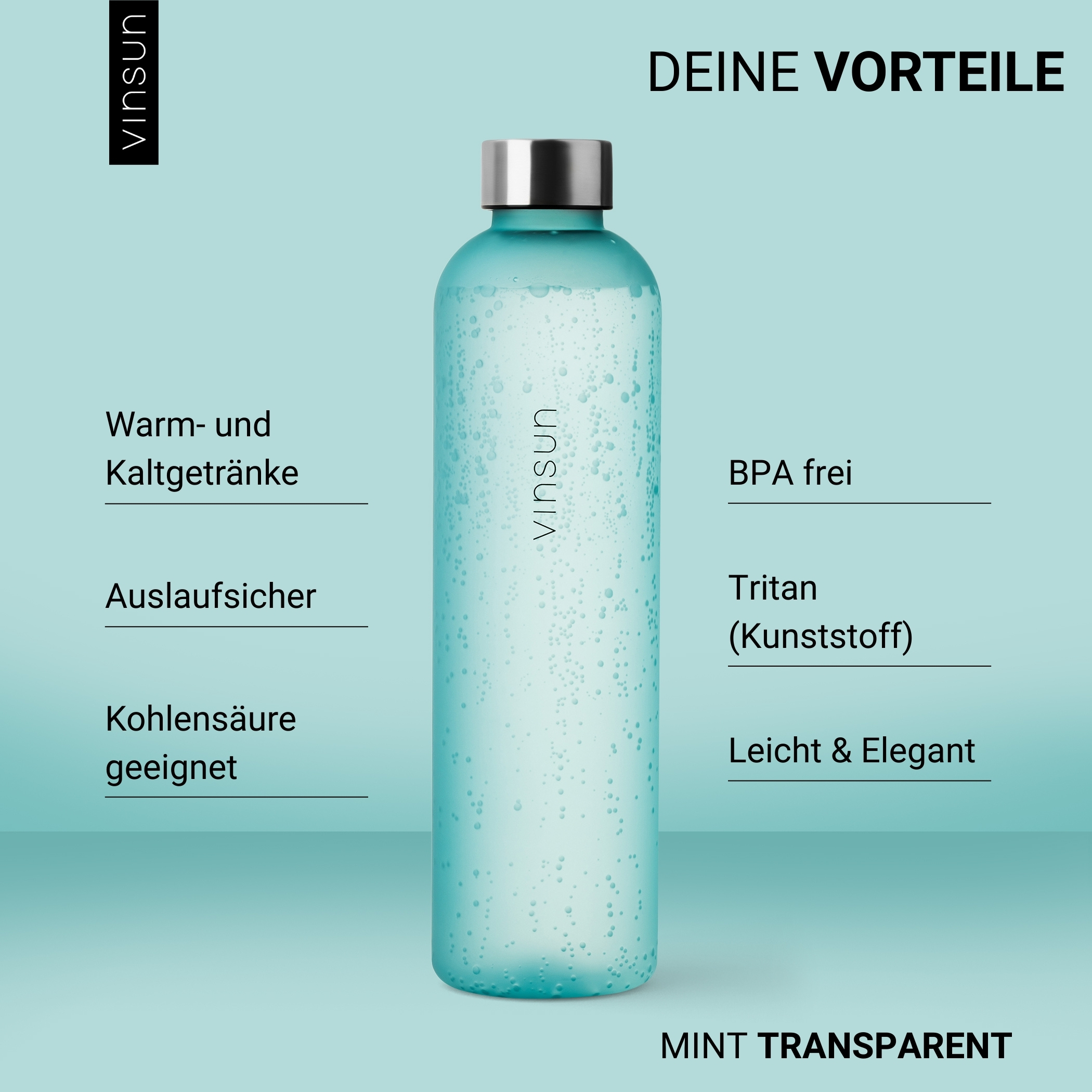Robuste und stilvolle Trinkflasche ideal für Sprudelwasser, Softdrinks oder Tee, egal ob warm oder kalt. Genießen Sie Ihr Getränk in modernem, minimalistischen Design mit der Trinkflasche von Vinsun. Mit dieser wiederverwendbaren Trinkflasche aus Tritan sind Sie für jede Gelegenheit optimal ausgestattet - Sport, Schule, Uni, Fahrrad, Freizeit - Ein perfekter Begleiter!