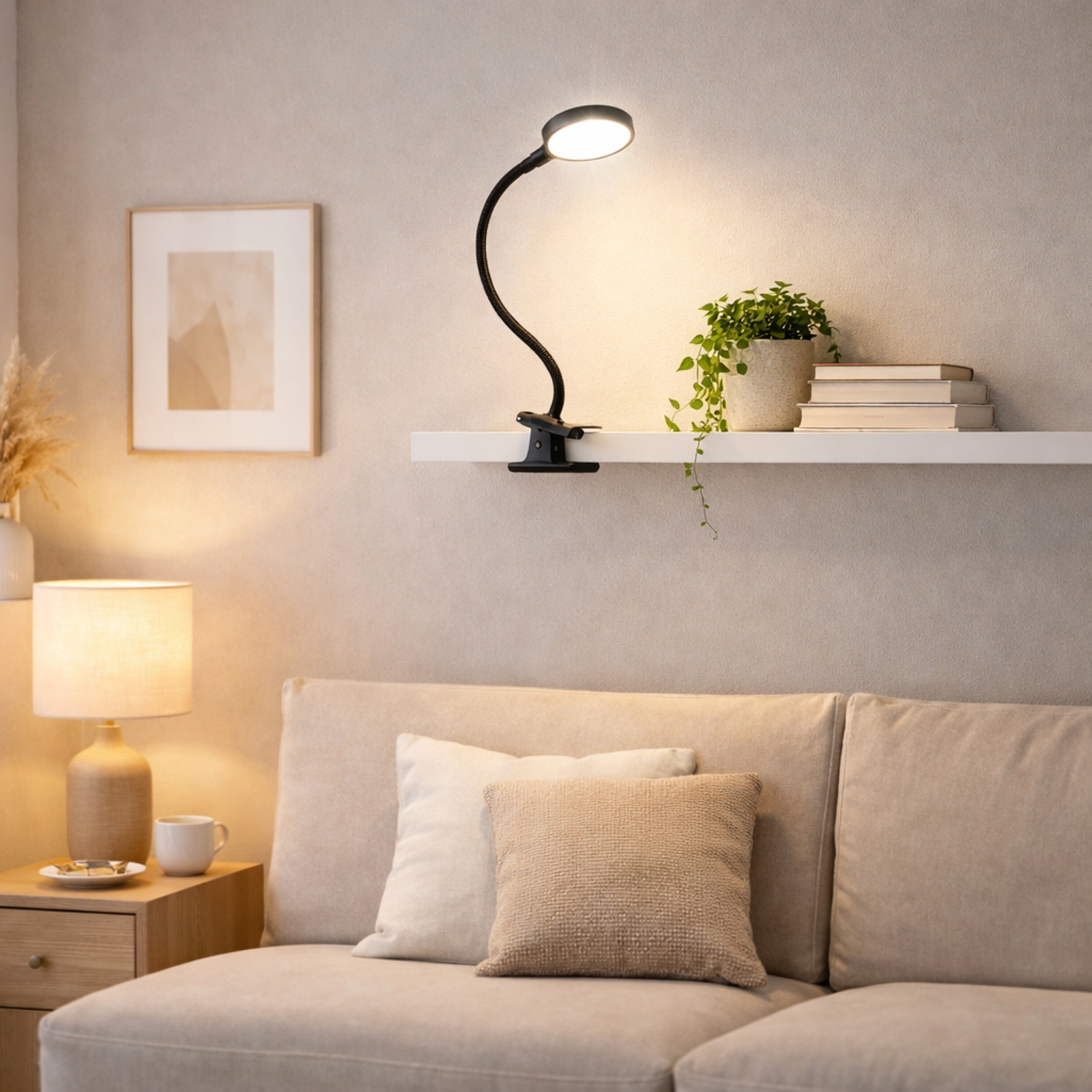 Diese LED Klemmlampe wurde als flexible Leselampe und Arbeitslampe für den Innenbereich entwickelt. Dank Klemmfuß und flexiblem Schwanenhals lässt sich das Licht gezielt platzieren – am Kopfteil des Bettes, am Regal, am Schreibtisch oder an einer Tischkante. So ersetzt die Klemmlampe oft eine klassische Tischlampe oder Nachttischlampe und sorgt trotzdem für ein angenehmes Leselicht.