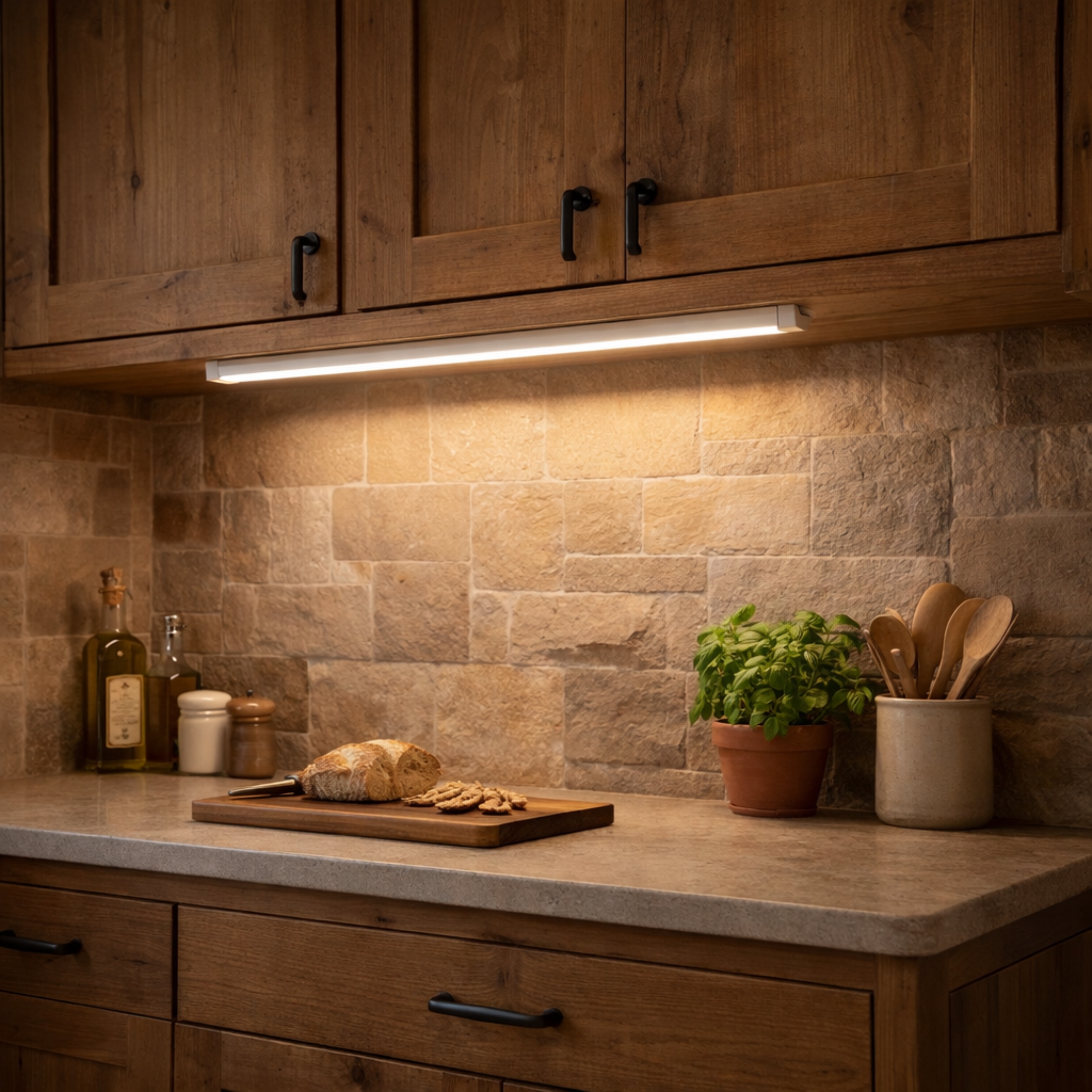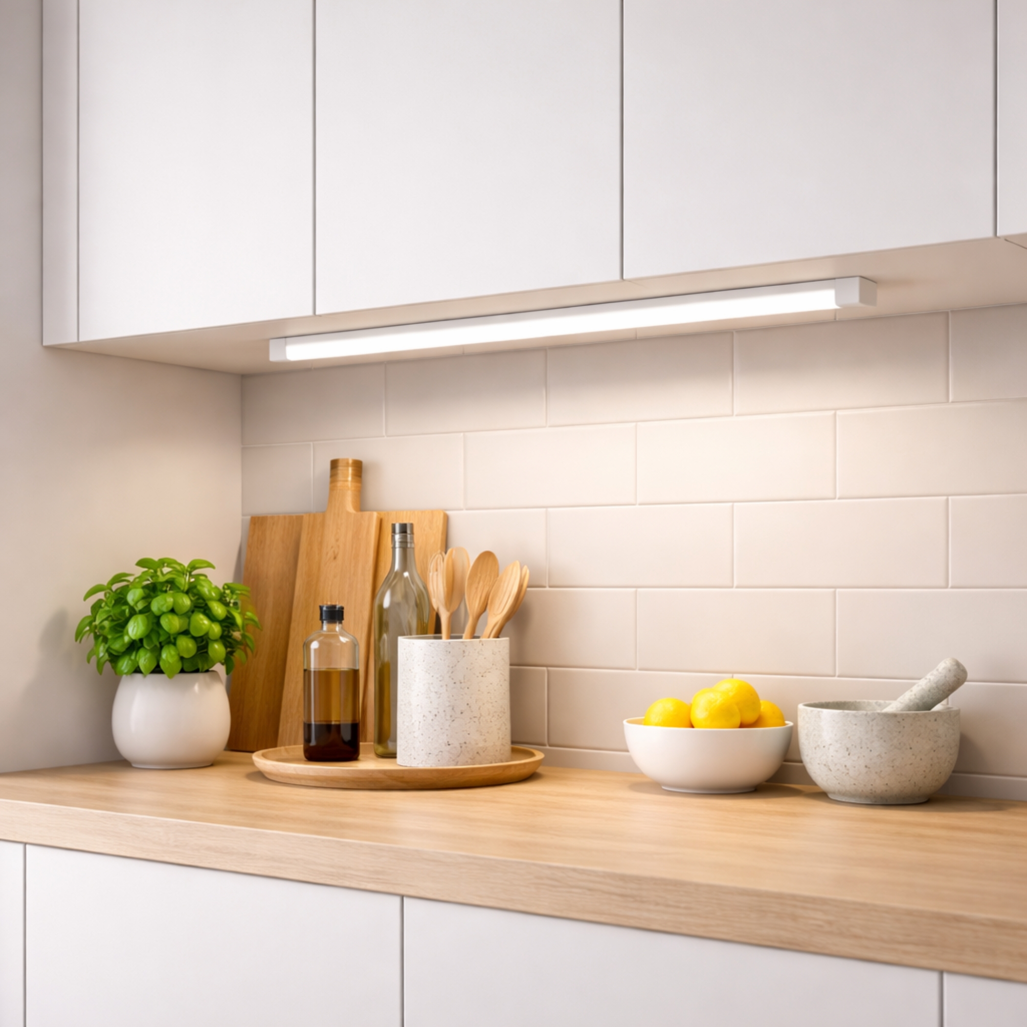 Bei nur 5 Watt Leistungsaufnahme und einer Lichtleistung von 800 Lumen liefert die Unterbauleuchte ausreichend neutralweißes Licht bei einem Abstrahlwinkel von 110°, optimal für gleichmäßige, richtungsorientierte Ausleuchtung. Eine Lichtleiste mit ausreichend Helligkeit und klarer neutralweißer Farbtemperatur für Arbeitsflächen in der Küche, Werkstatt oder im Büro.