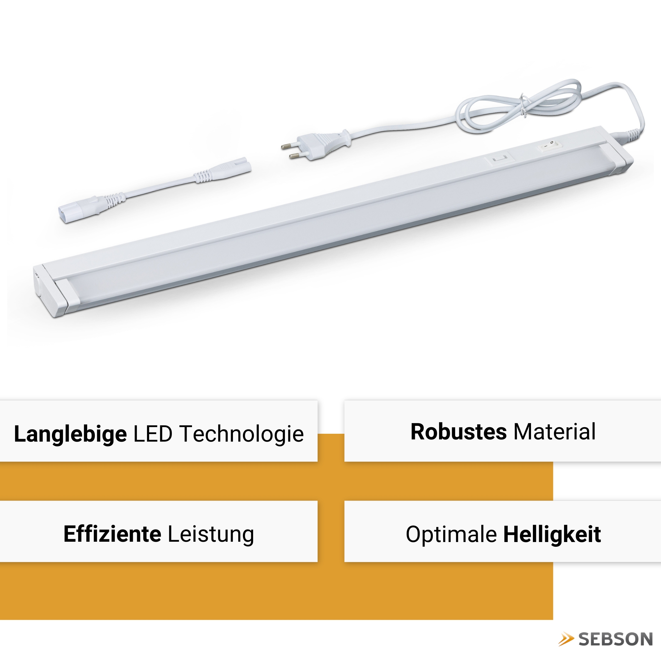 Diese LED Unterbauleuchte von SEBSON wurde für flexible Beleuchtung im Innenbereich entwickelt. Durch das schlanke Design lässt sich diese LED Leiste dezent unter Hängeschränken, an Regalböden oder anderen Flächen montieren und eignet sich damit besonders für Küchen, Wohnbereich, Büro oder Werkstätten.