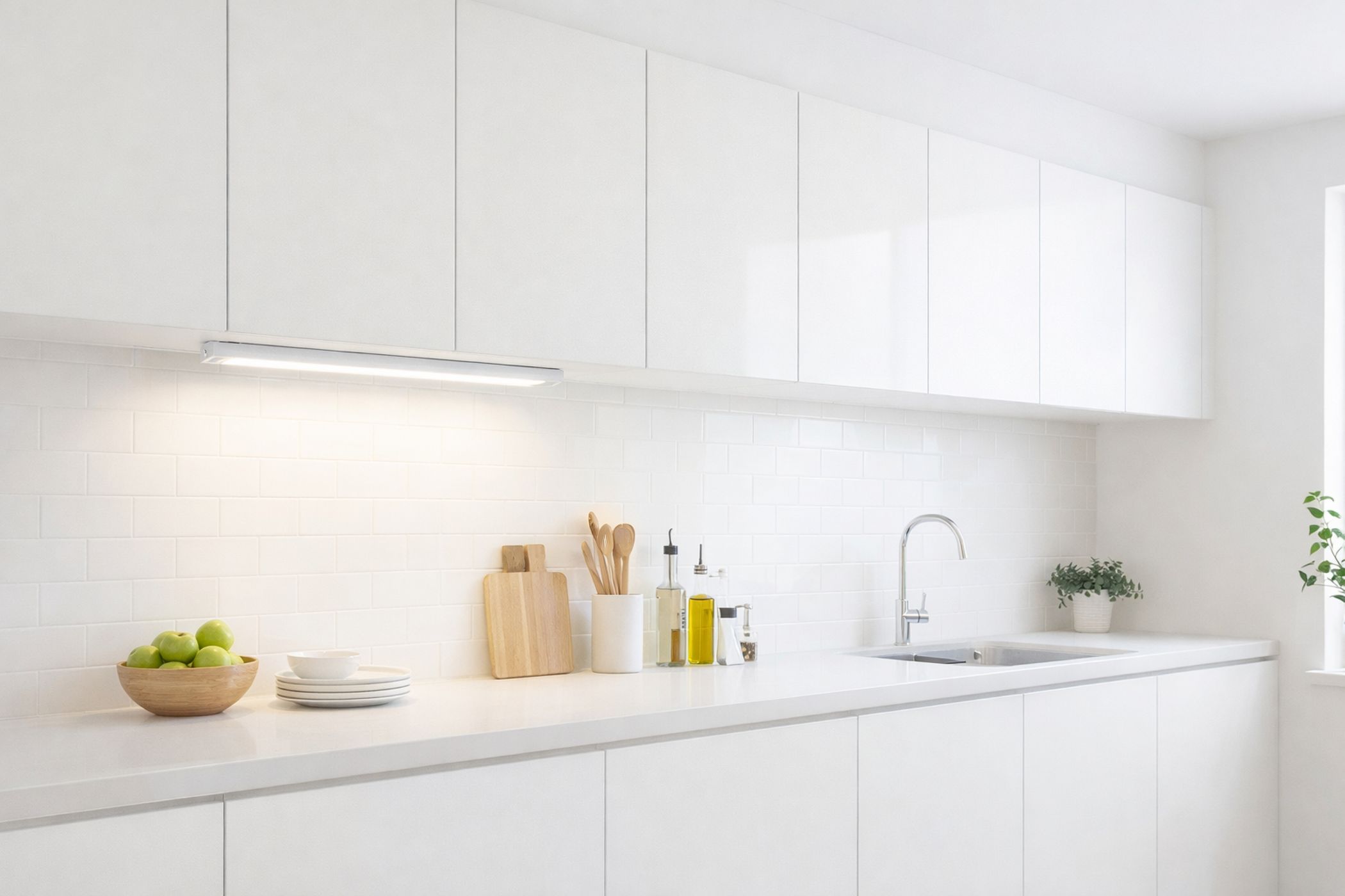 Die Helligkeit der Lichtleiste kann direkt über den Schalter in drei Stufen angepasst werden. So lässt sich zwischen einer sehr hellen Arbeitsbeleuchtung, einer reduzierten Helligkeit und einem sehr dezenten Orientierungslicht wählen – ganz ohne zusätzlichen Dimmer. Über die Schalterabfolge kann die gewählte Stufe gespeichert werden, sodass die Unterbauleuchte beim nächsten Einschalten wieder mit der zuletzt genutzten Helligkeit arbeitet.