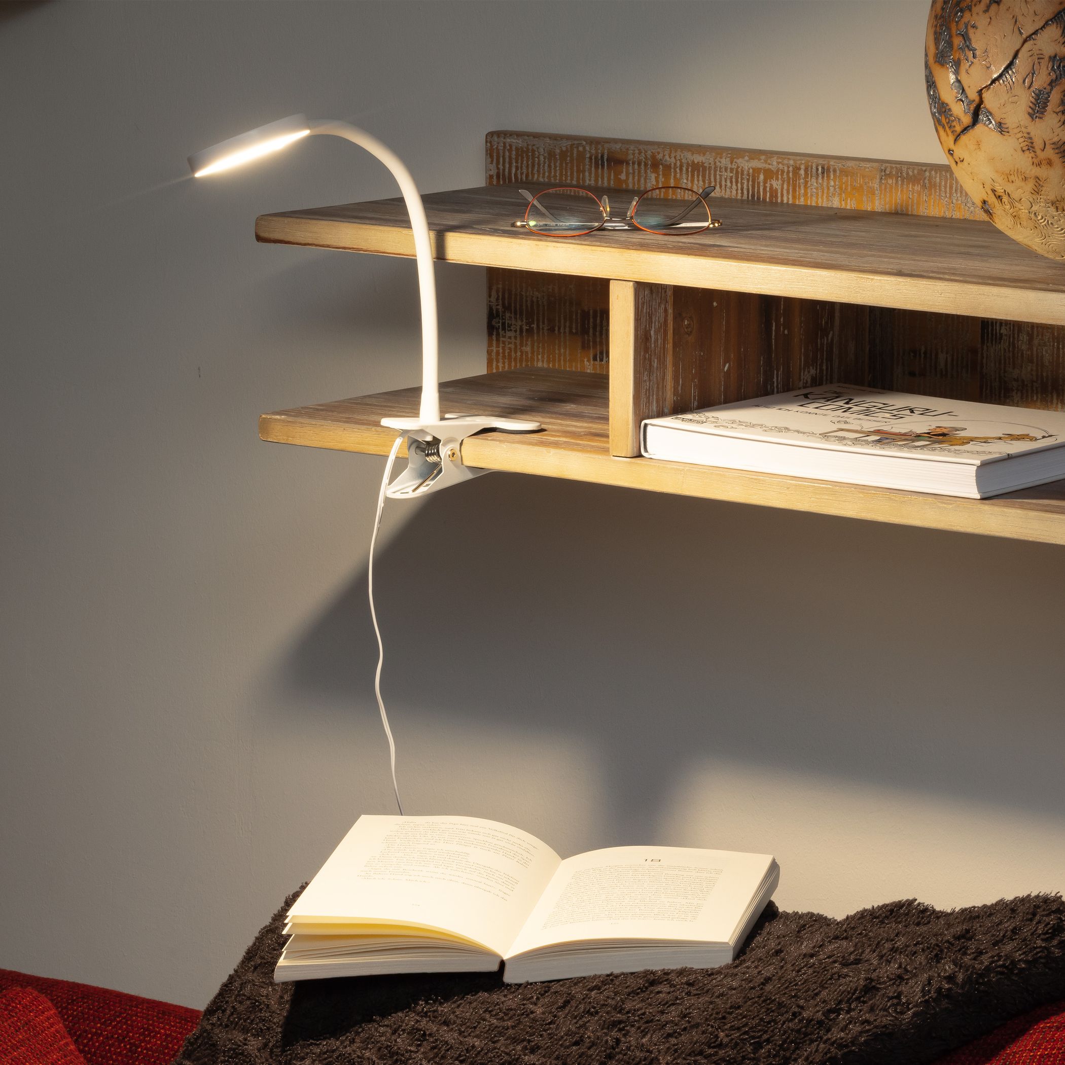Wer nach einer Alternative zu klassischen Tischlampen sucht, findet in dieser schlanken Klemmleuchte eine platzsparende Lösung, die sich unauffällig in viele Wohn- und Arbeitsbereiche einfügt – vom Bett über den Schreibtisch bis hin zum Kinderzimmer. So lässt sich die Lampe je nach Bedarf als Schreibtischlampe, Nachtischlampe oder kleine LED Leselampe nutzen.
