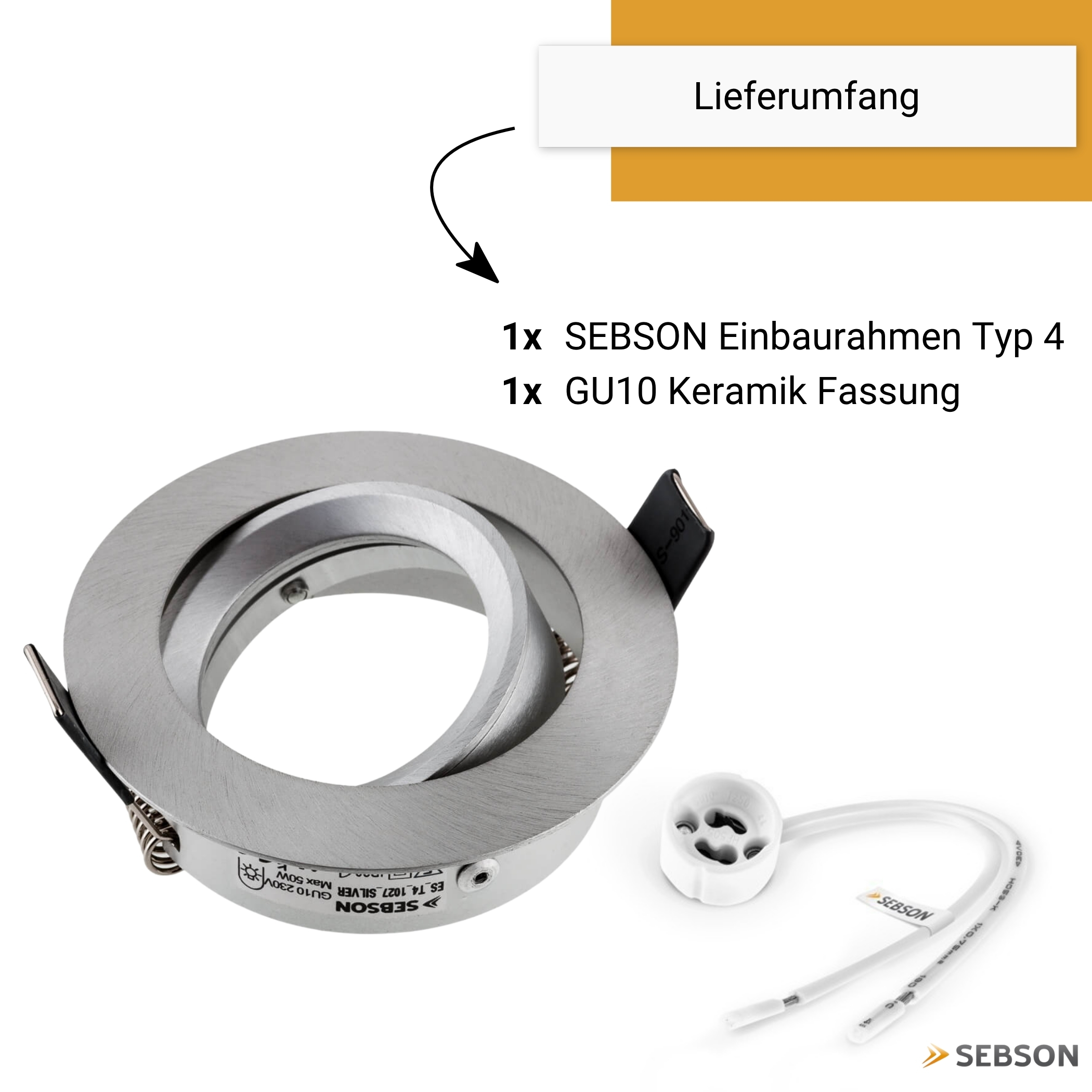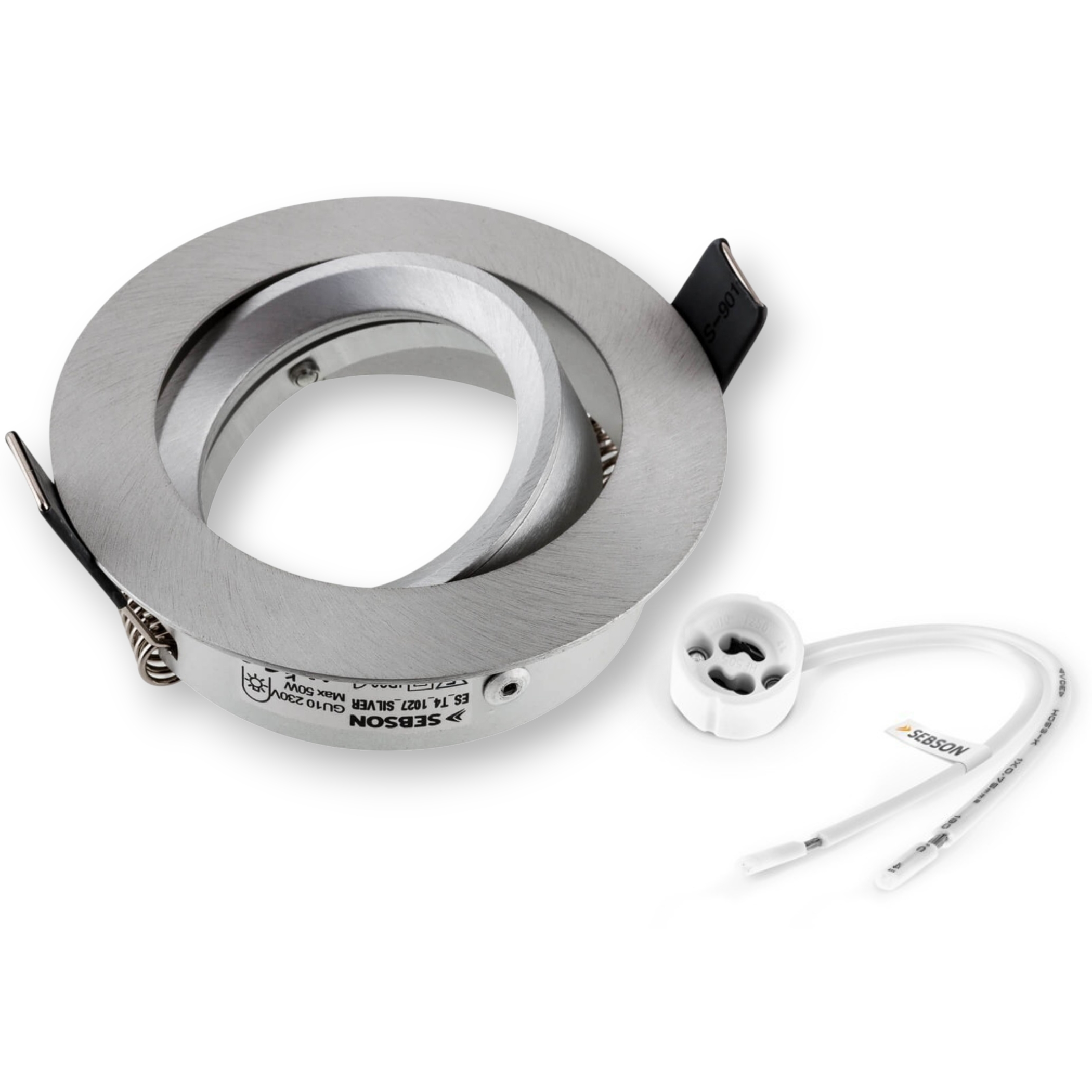 | Dieser Einbaurahmen eignet sich hervorragend für Leuchtmittel mit GU10 Fassung. Im Lieferumfang sind ein Einbaurahmen und eine GU10 Fassung enthalten. Der Einbaurahmen ist matt silber. Das Material ist Aluminium. Das Innenteil des Einbaurahmens ist schwenkbar. Der Schwenkbereich liegt bei bis zu 50%. Somit können Sie verschiedene Objekte besser in Szene setzen. Der Einbaurahmen ist insgesamt 25mm hoch. Die Höhe der Deckenstärke liegt bei 22mm. Der Durchmesser beträgt 84mm. Der Durchmesser des Einbaulochs sollte bei 75mm liegen. |