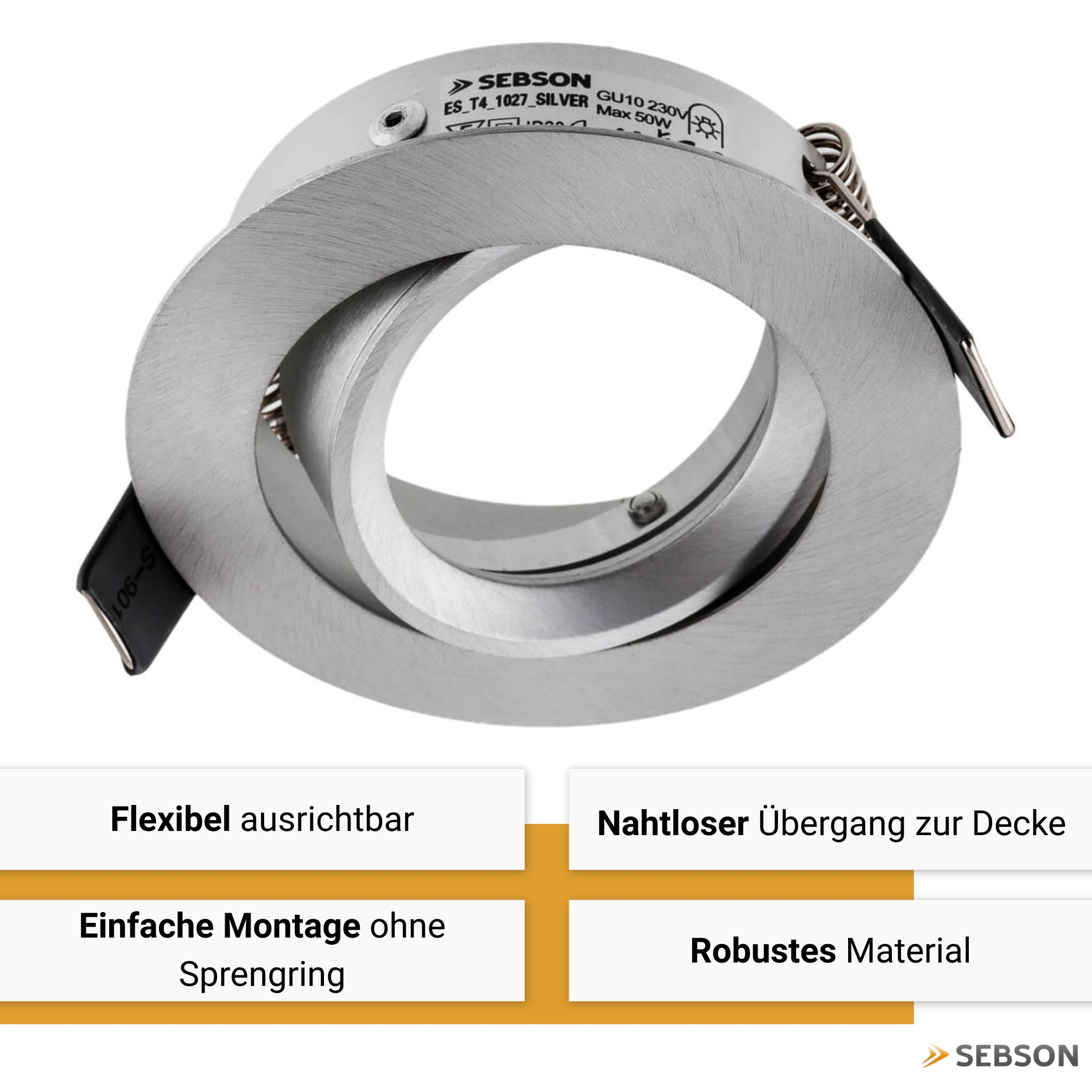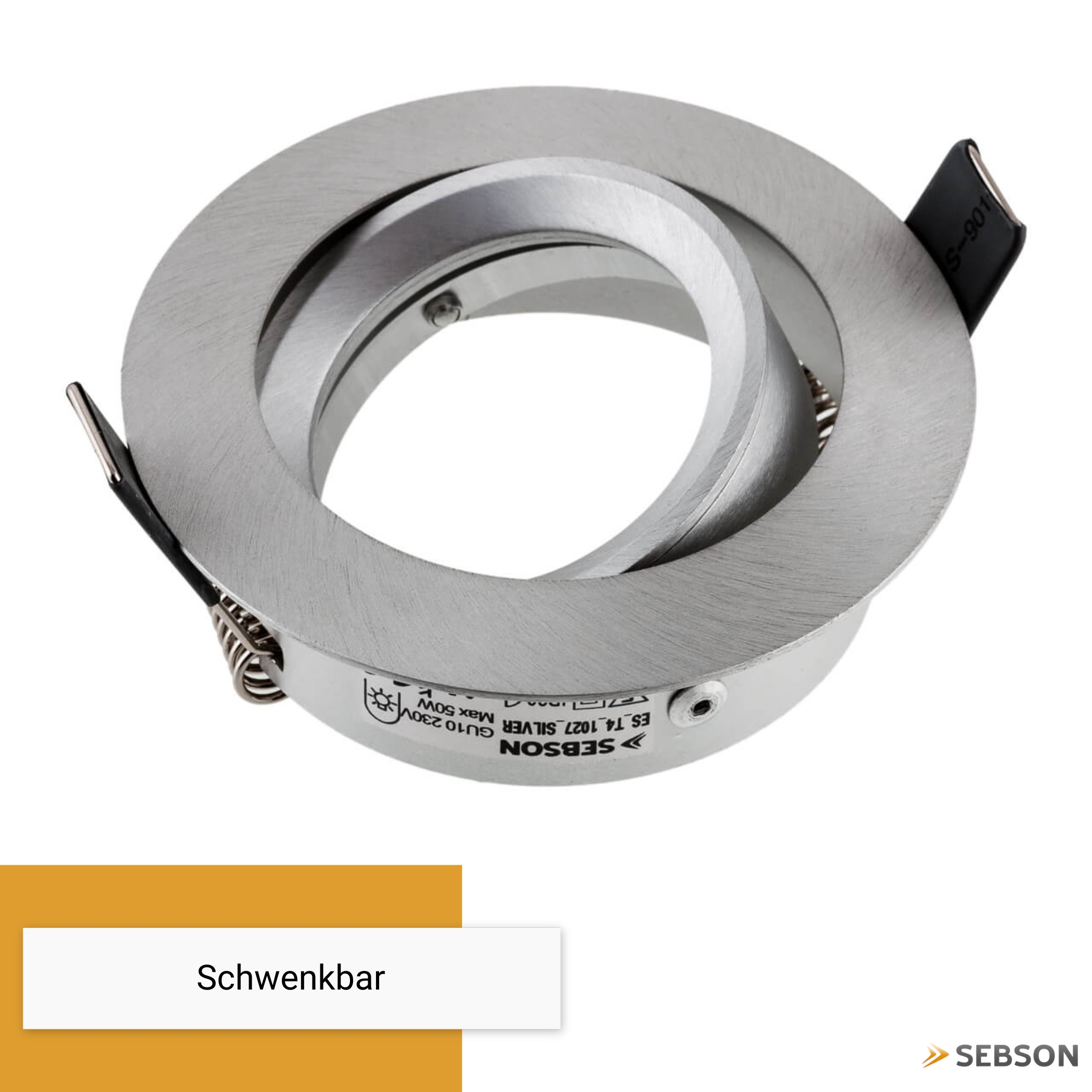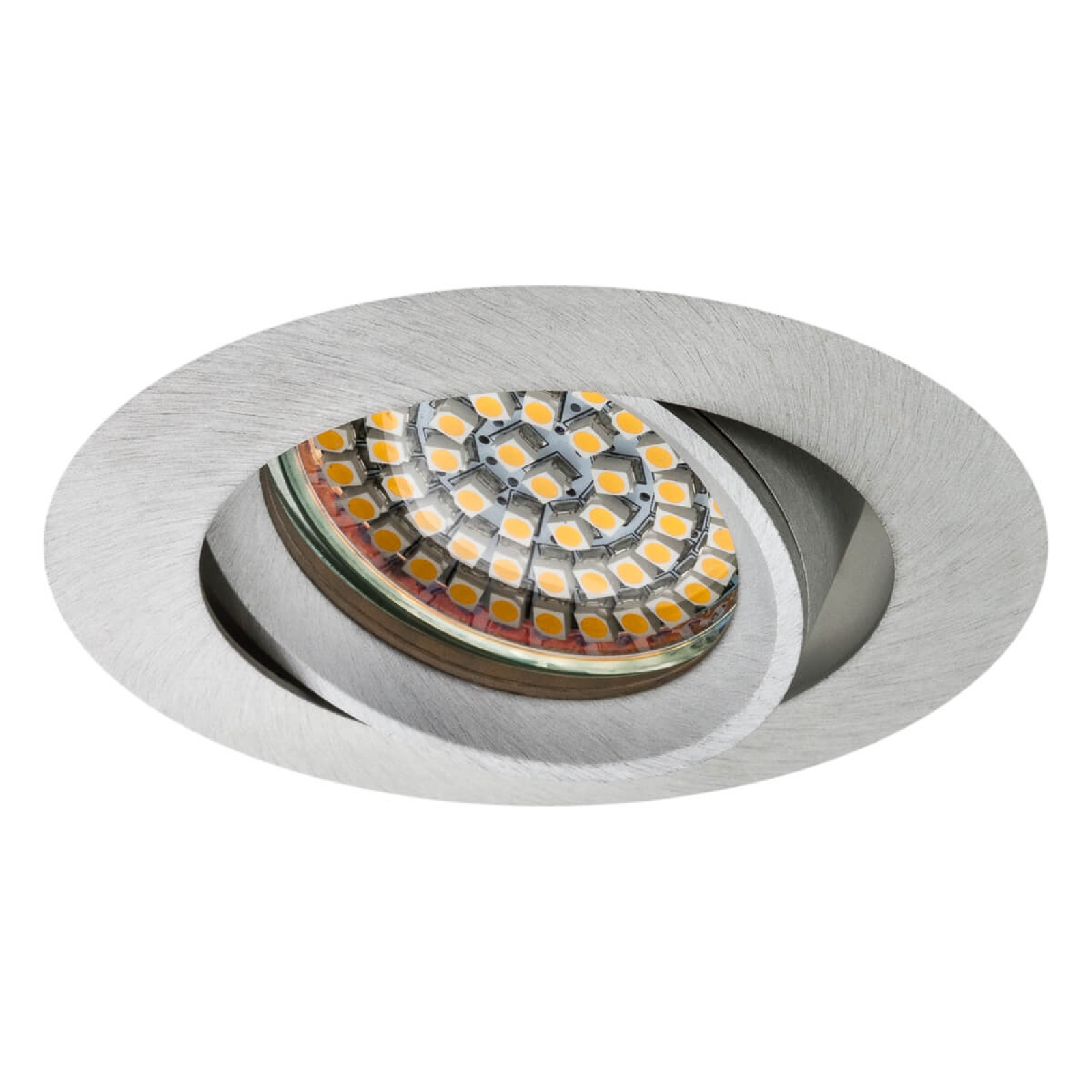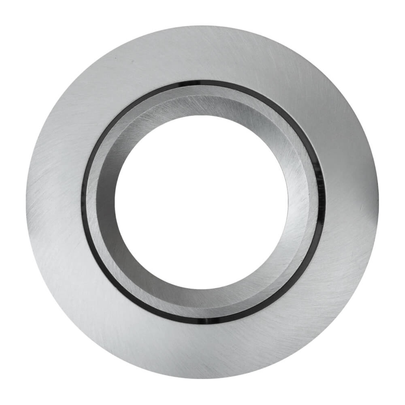 Dieser Decken Einbaurahmen besticht durch seine schlichte Form und den großen Schwenkbereich von bis zu 40°. Die gebürstete, matte Oberfläche verleiht dem Einbaurahmen seine besondere Note. Die leicht konische Rosette mit nur 1 mm Stärke am äußeren Rand geht optisch fast nahtlos in die Deckenoberfläche über. Die große Facette des inneren Halteringes wirkt schlicht und edel. Er ist einfach aufgesteckt und hält die Lampe im Rahmen ohne unschönen Sprengring (Ringfeder).
